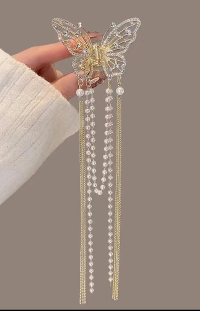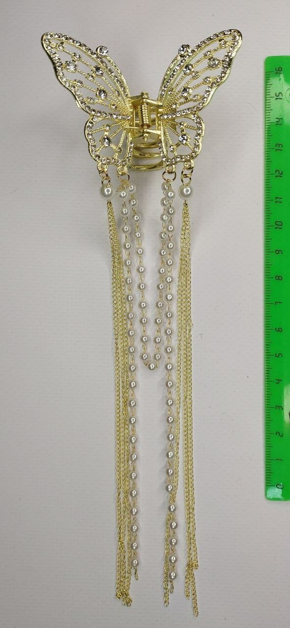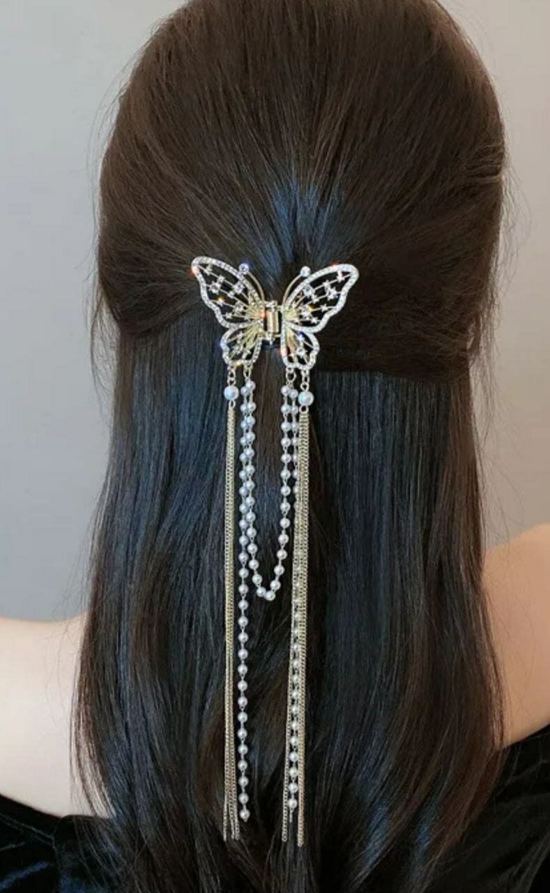 Не упустите возможность добавить в свою коллекцию аксессуаров для волос блестящий краб-бабочку с кисточками и стразами.