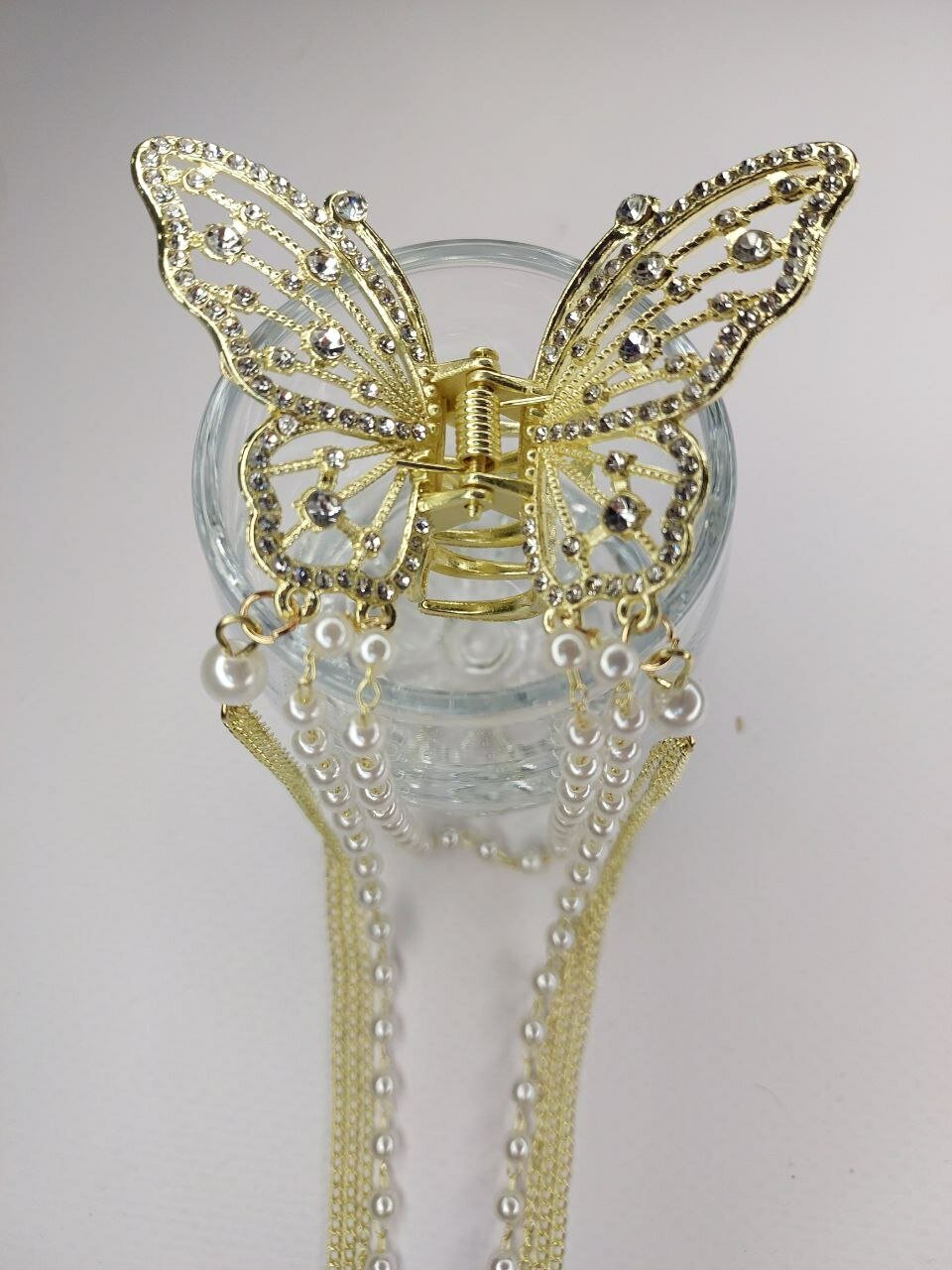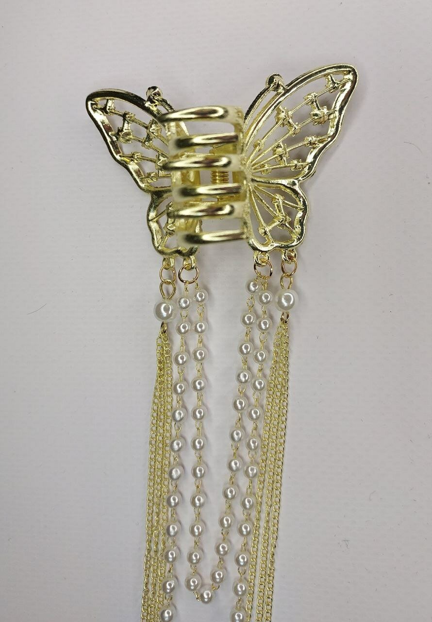 Блестящий краб-бабочка для волос с кисточками со стразами и жемчугом (имитация) . Золото