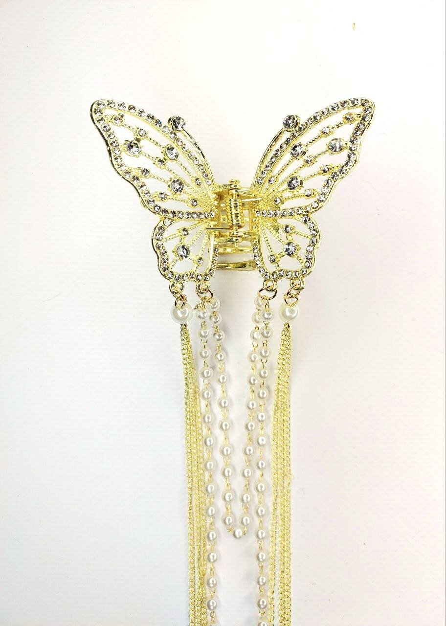 Заколка-краб для волос со стразами и жемчугом (имитация) . Порхающая бабочка инкрустирована стразами добавит вашему образу женственности. Создаст легкое, воздушное и блестящие настроение, поможет легко уложить волосы.