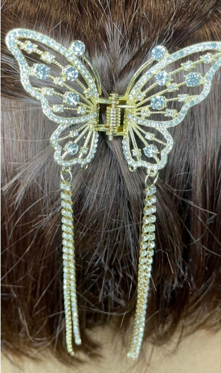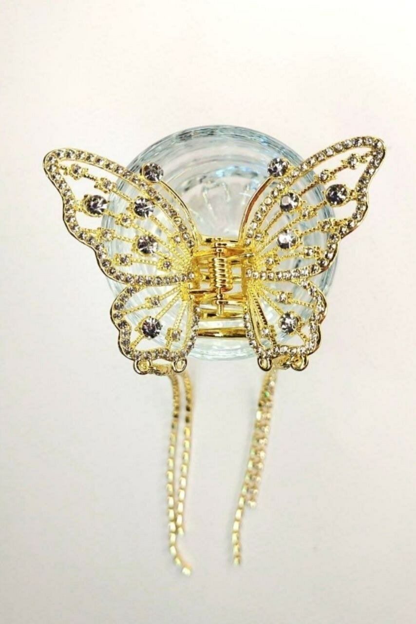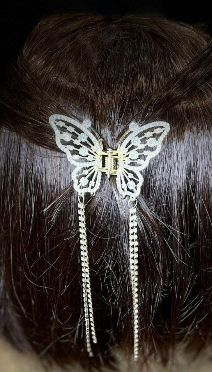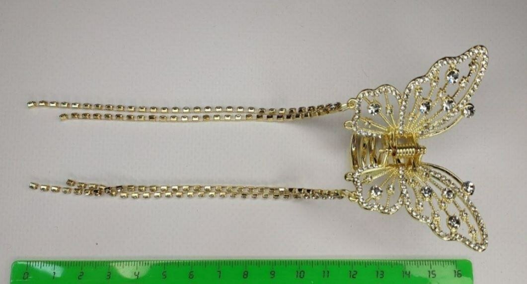 Заколка украшена кисточками из страз, которые придают ей изысканный и элегантный вид. Золотистый цвет и белый бесцветный декор делают ее подходящей для любого стиля и цвета волос.