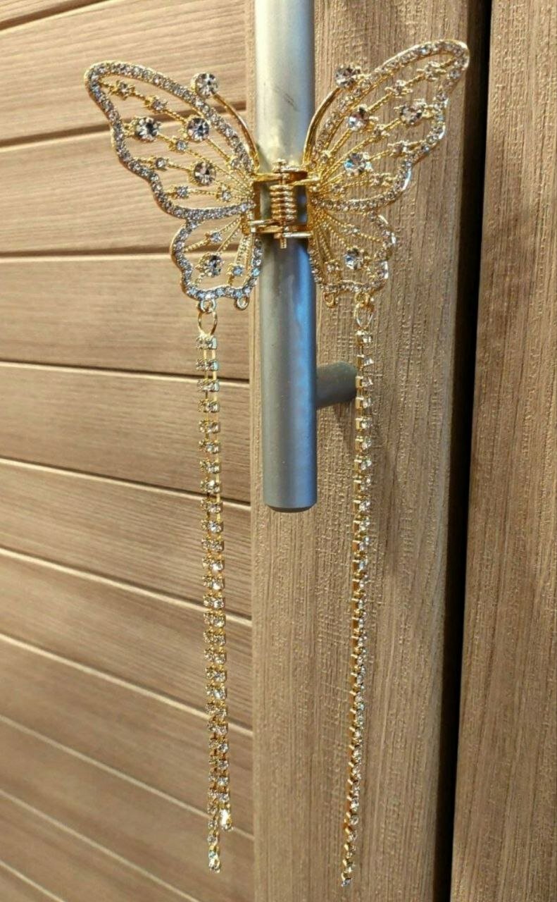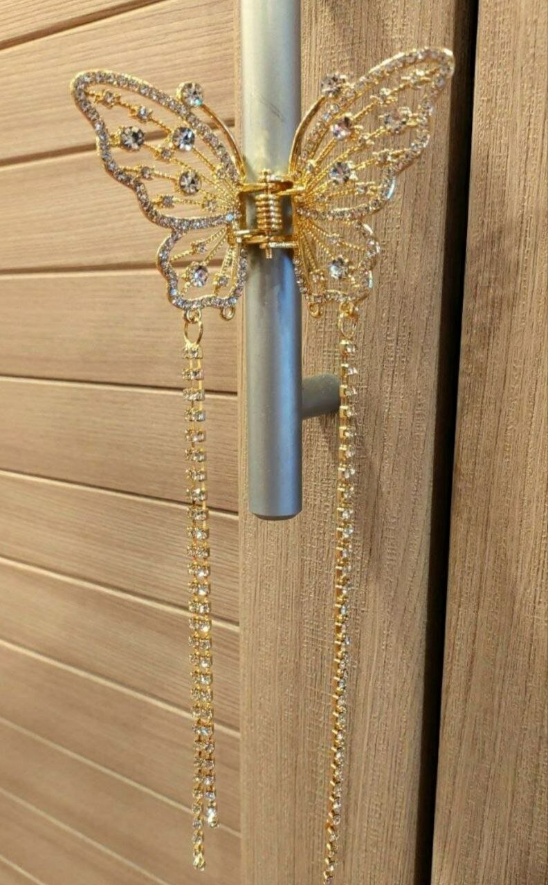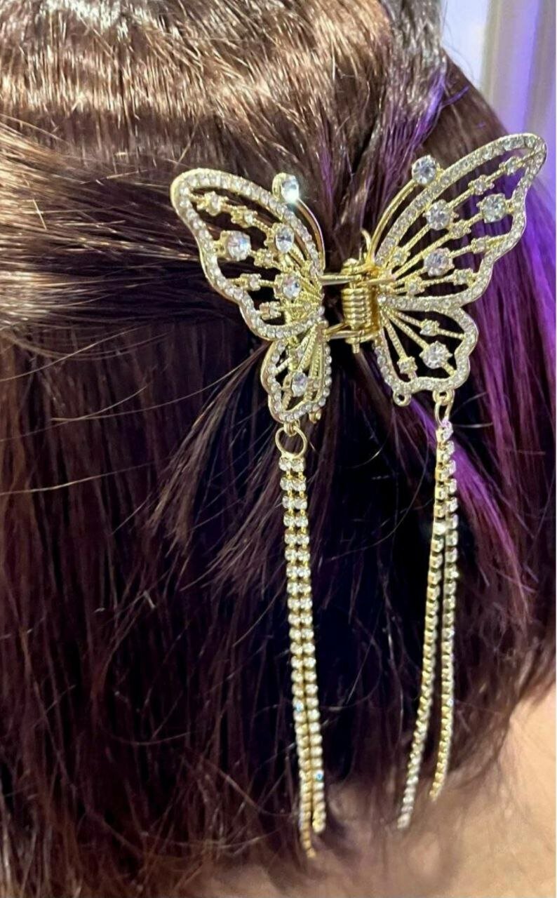 Заколка украшена кисточками из страз, которые придают ей изысканный и элегантный вид. Золотистый цвет и белый бесцветный декор делают ее подходящей для любого стиля и цвета волос.