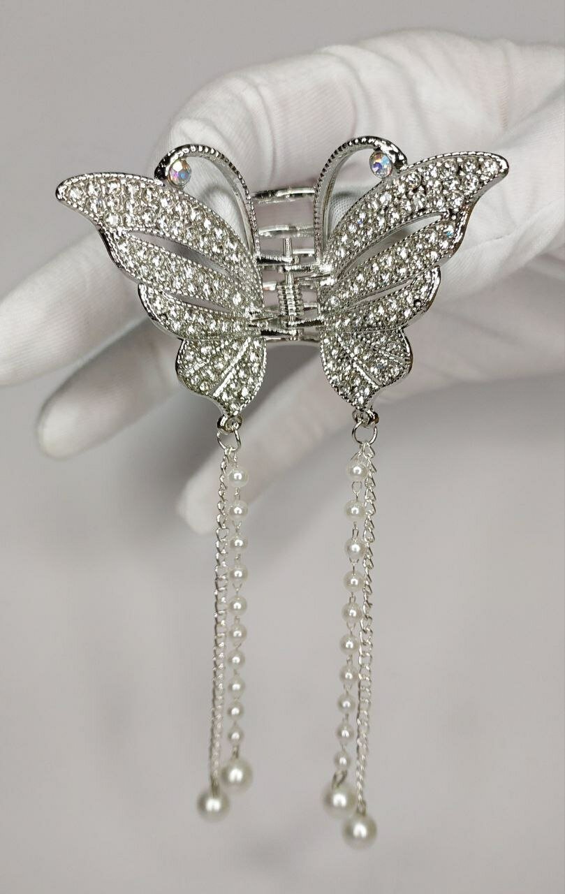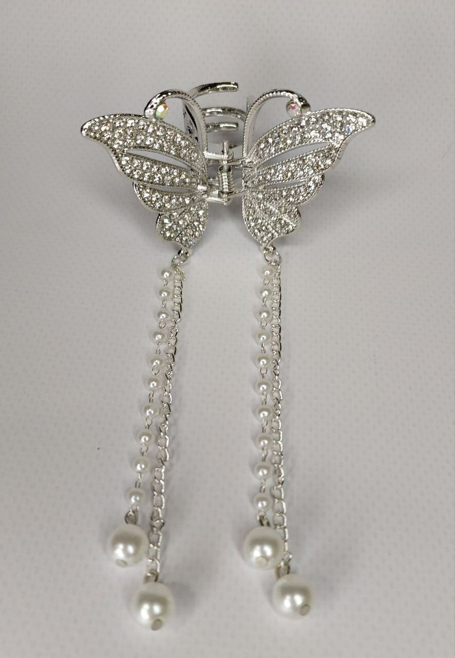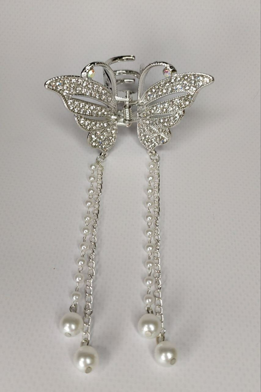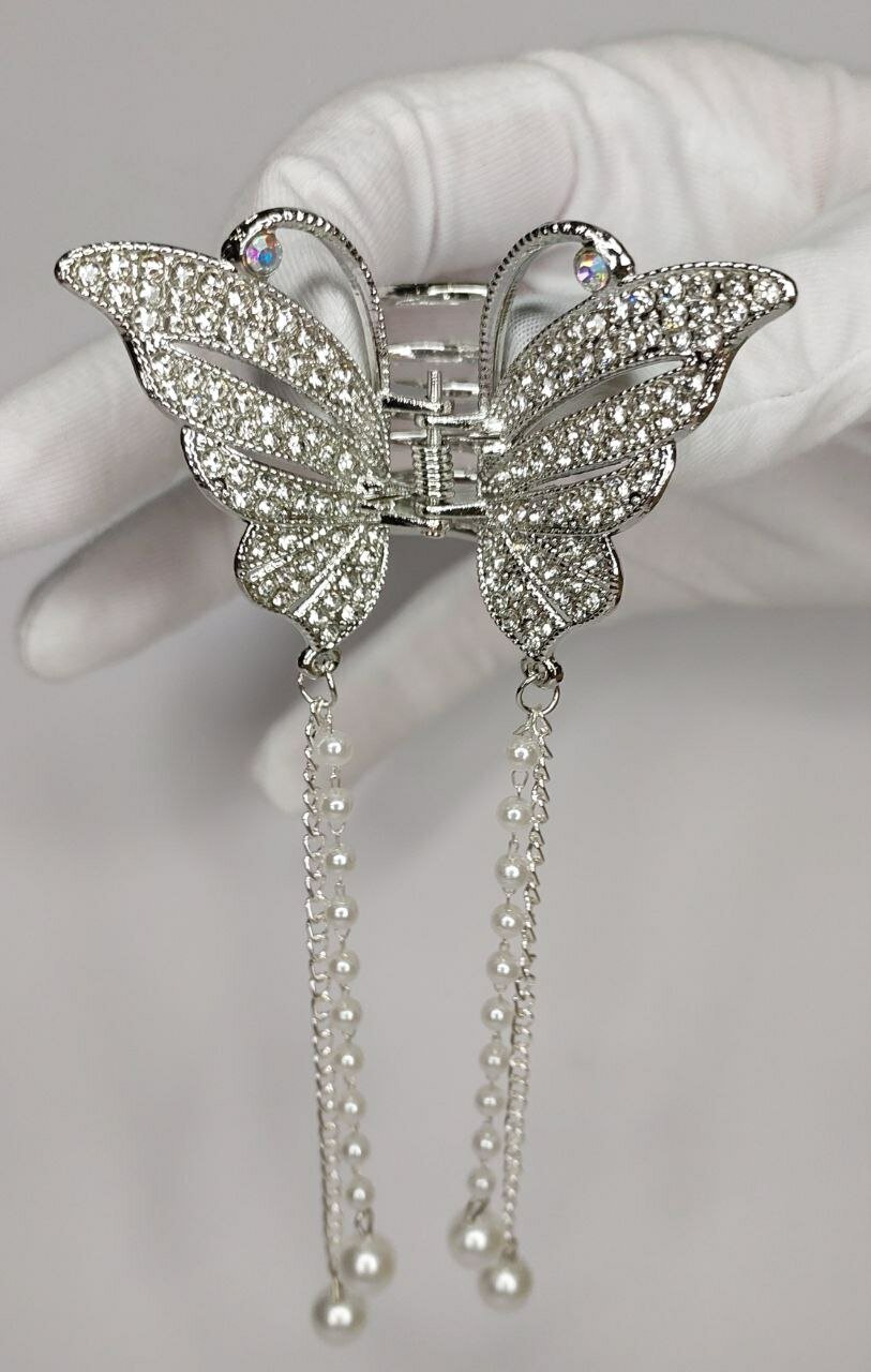 Краб-бабочка украшена стразами, которые придают аксессуару роскошный вид. Цвет заколки - серебристый, что делает ее подходящей для любого стиля и цвета одежды.