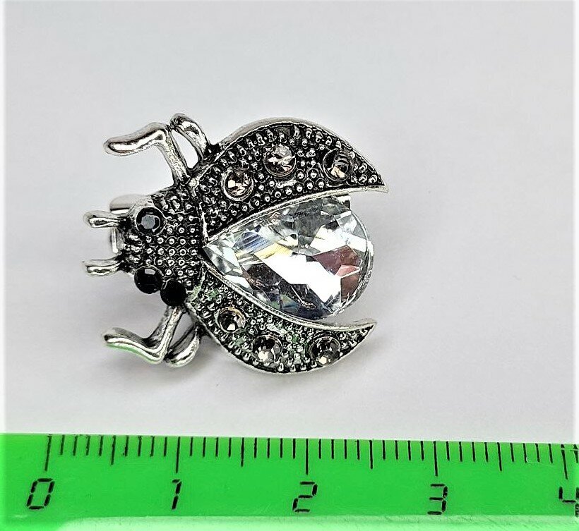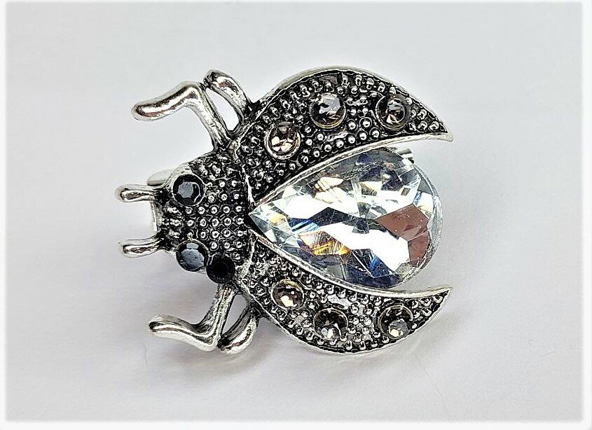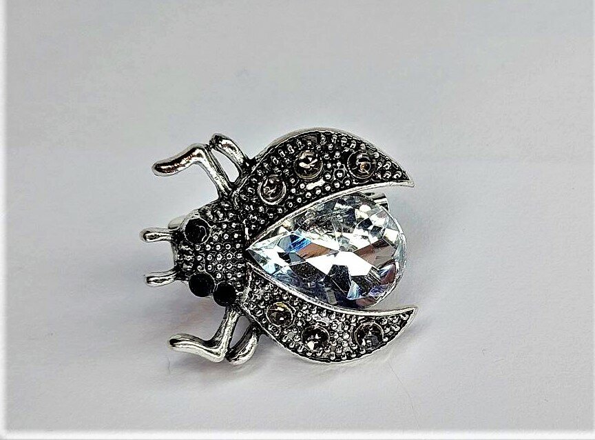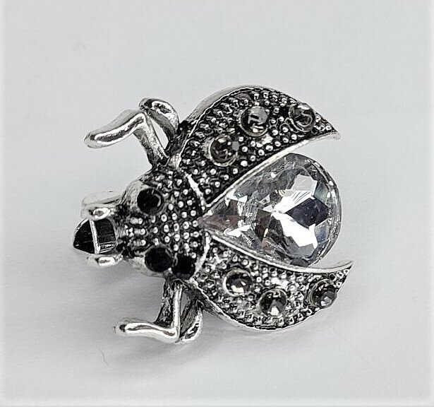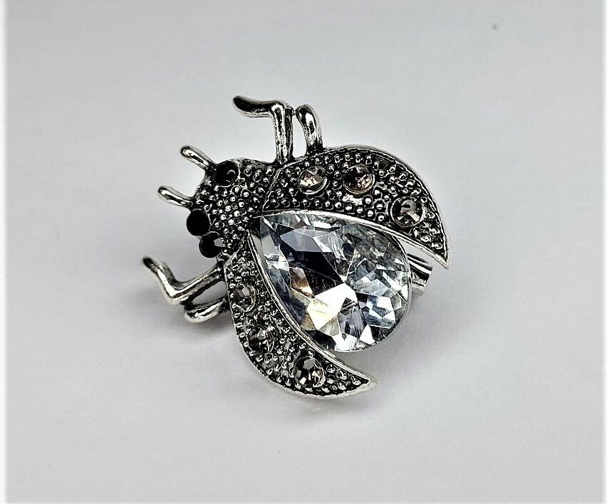 Брошь "Жук" украшена белыми стразами и эмалью, что придает ей блеск и сияние. Цвет товара - белый, бесцветный и серебряный, что делает ее подходящей для любого образа и сезона.