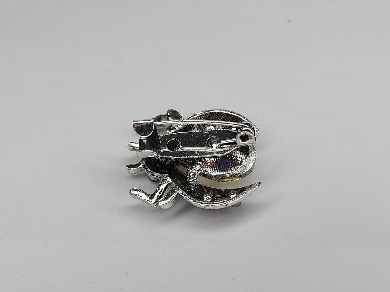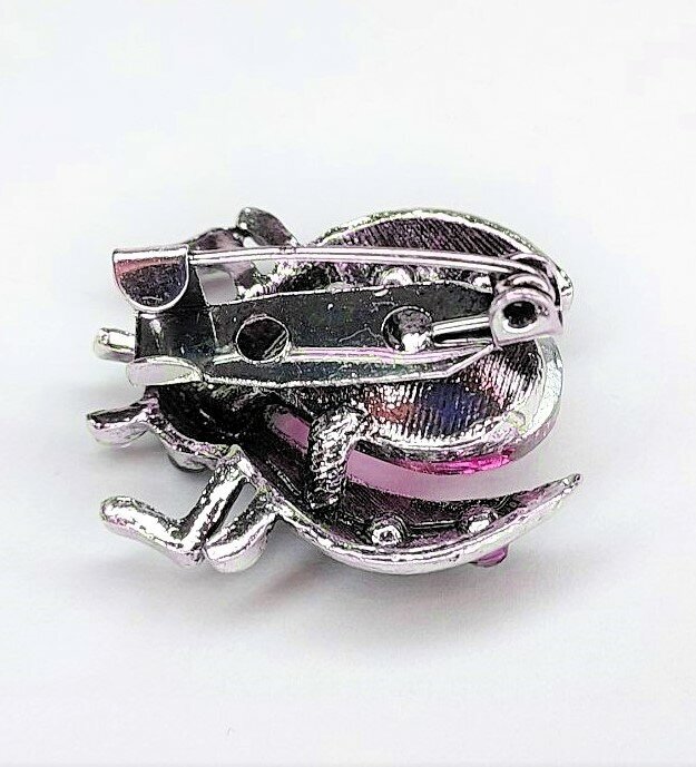 Брошь "Жук" изготовлена из бижутерного сплава и металла, что гарантирует ее долговечность и надежность. Вставка из страз и эмали придает украшению блеск и яркость.