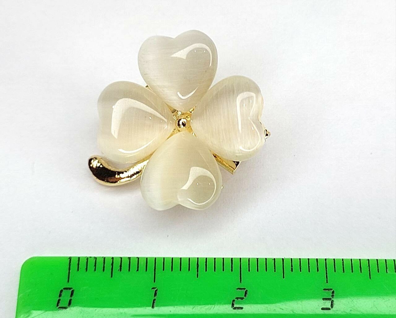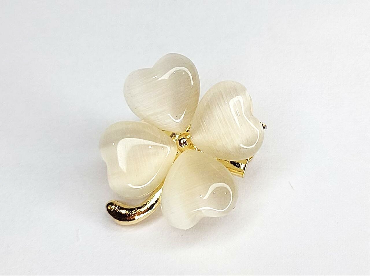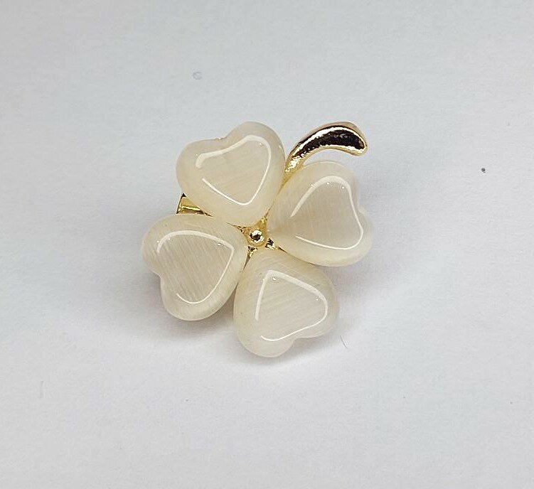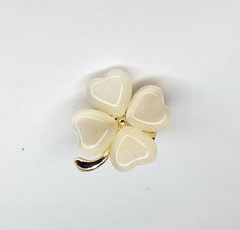 Брошь "Четырехлистный клевер" выполнена из металла, что гарантирует ее долговечность и надежность. Цвет броши - белый с золотыми и бежевыми оттенками, что придает ей изысканный и стильный вид.