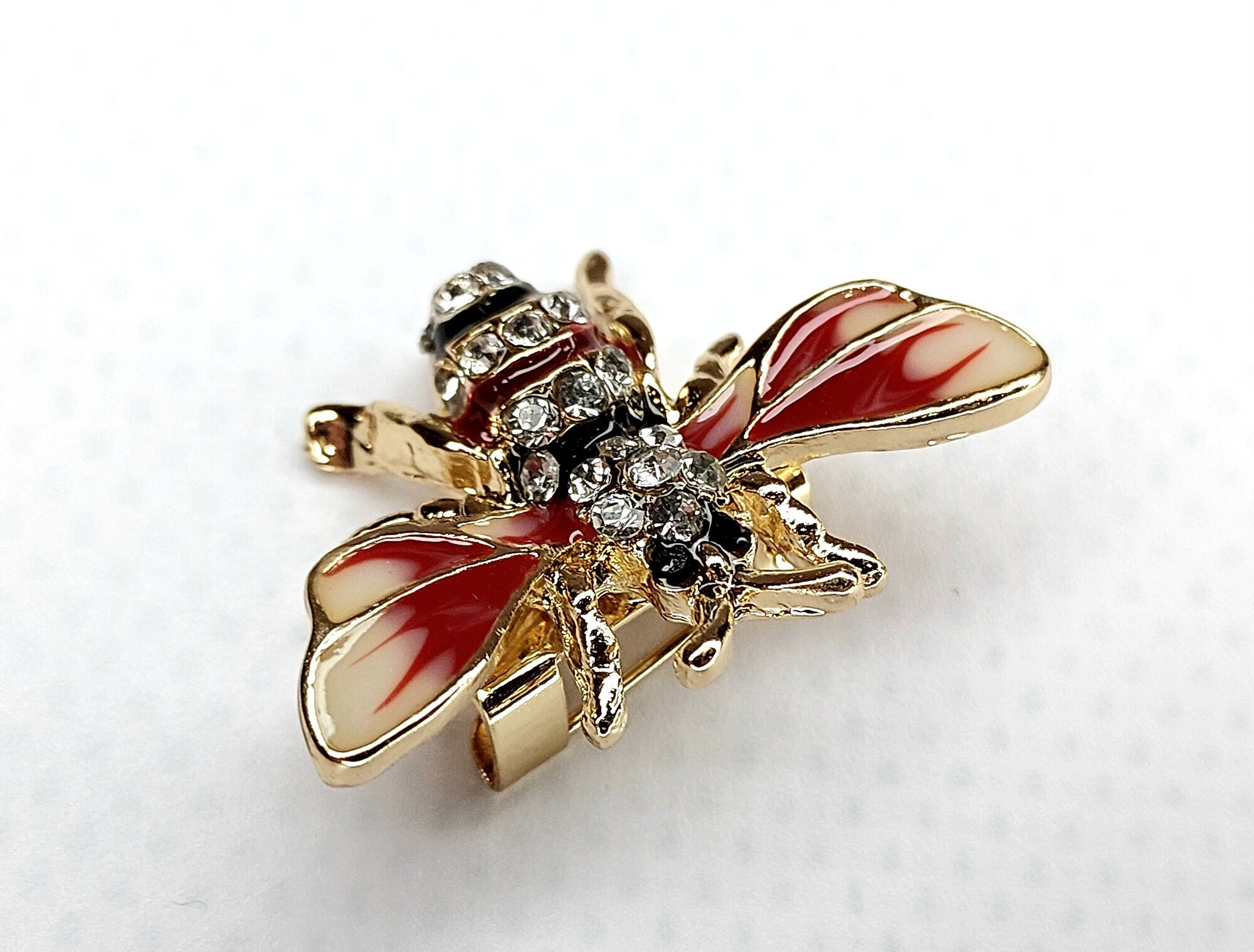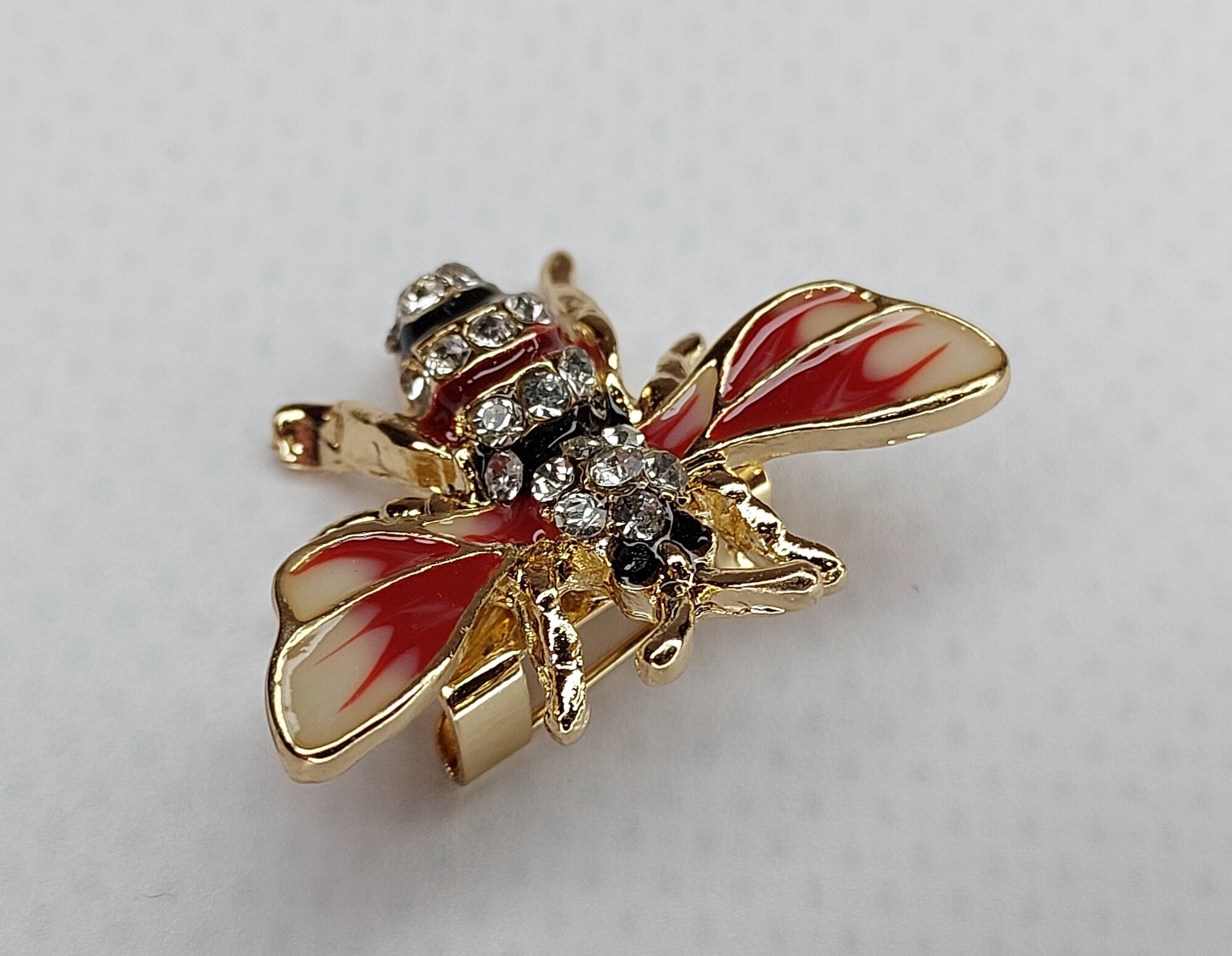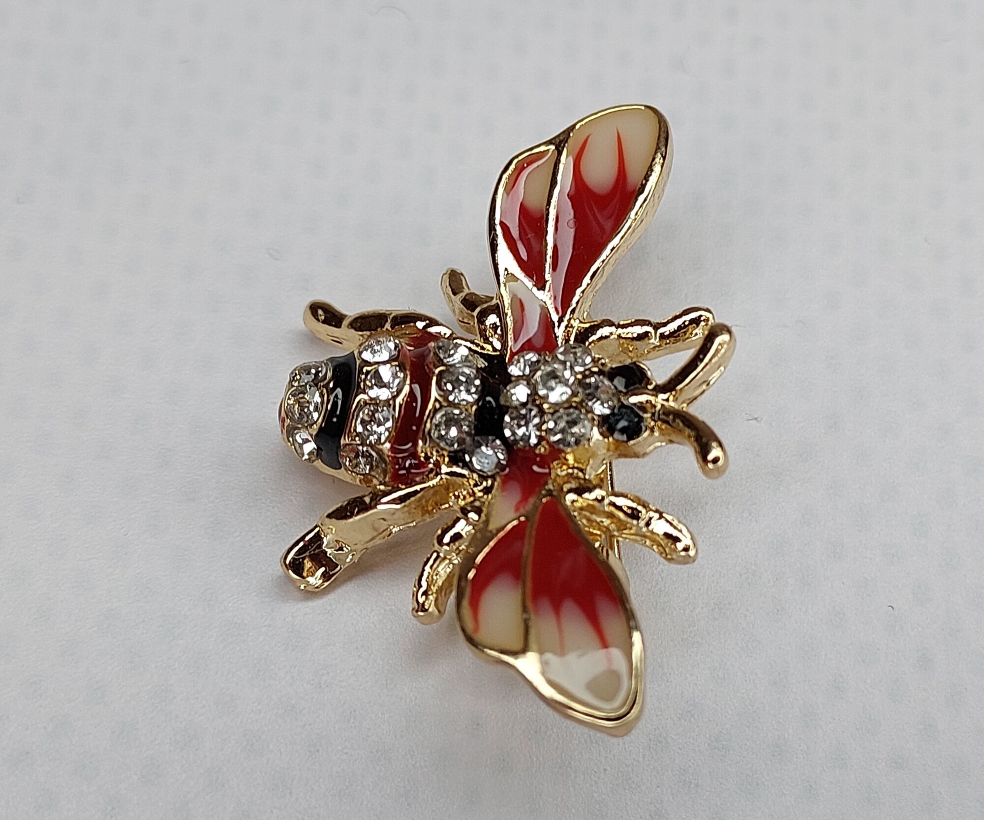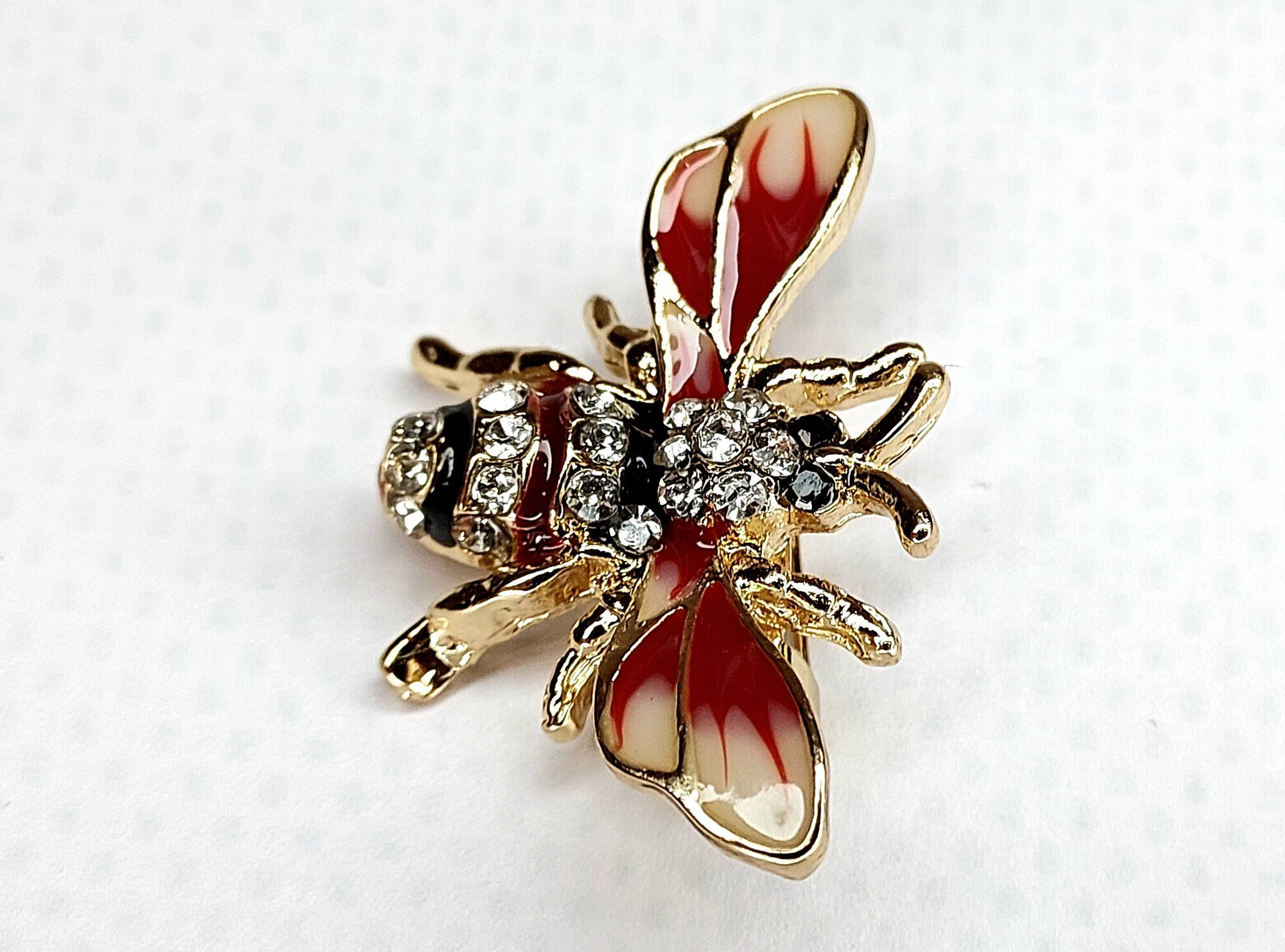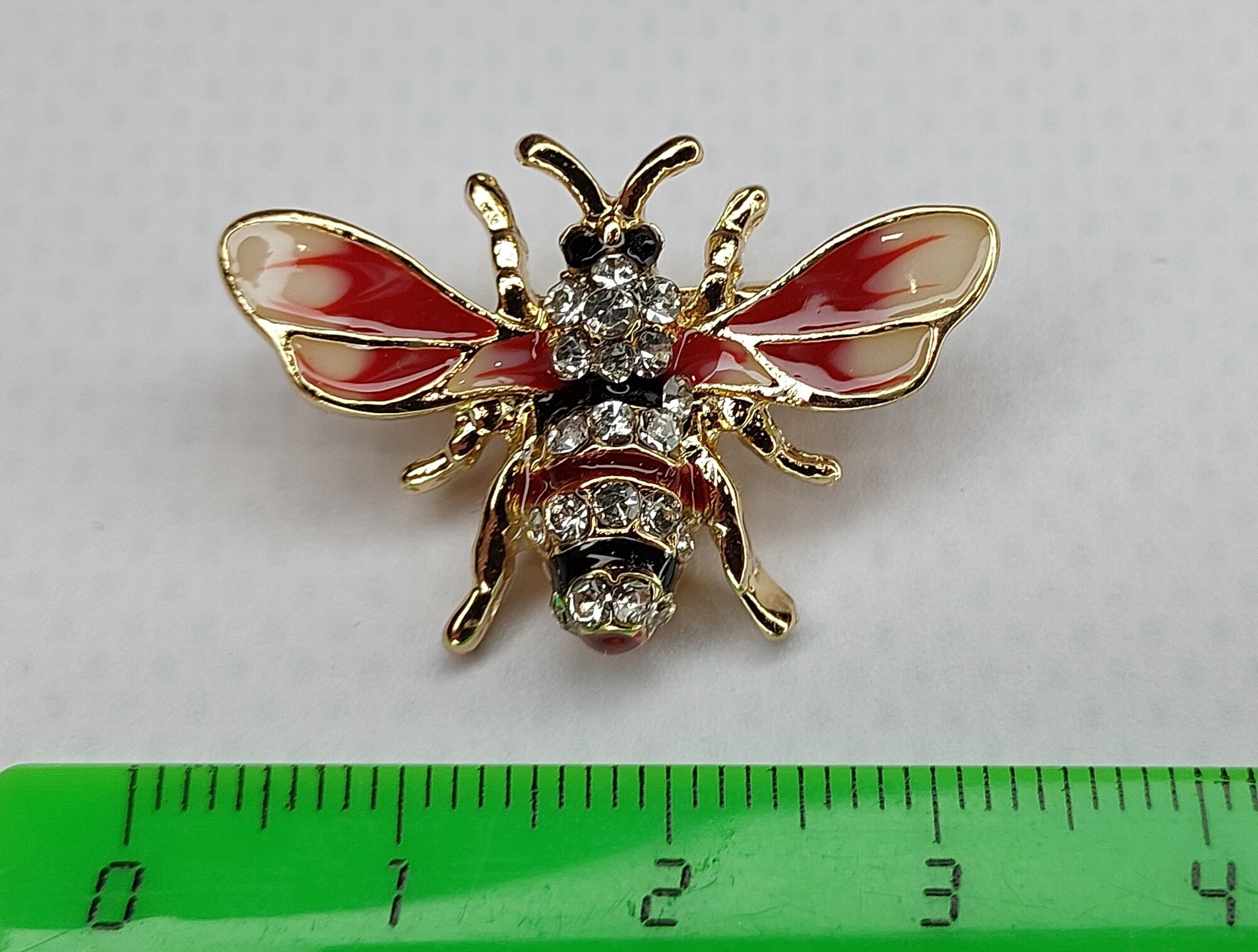 Брошь украшена стразами, которые придают ей блеск и сияние. Это делает аксессуар еще более привлекательным и заметным.