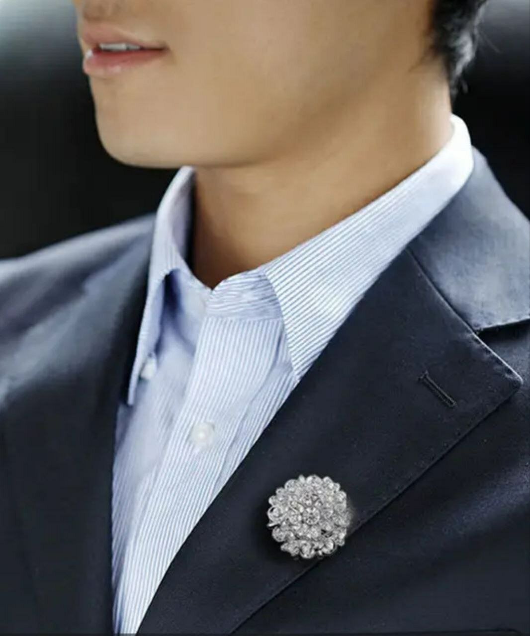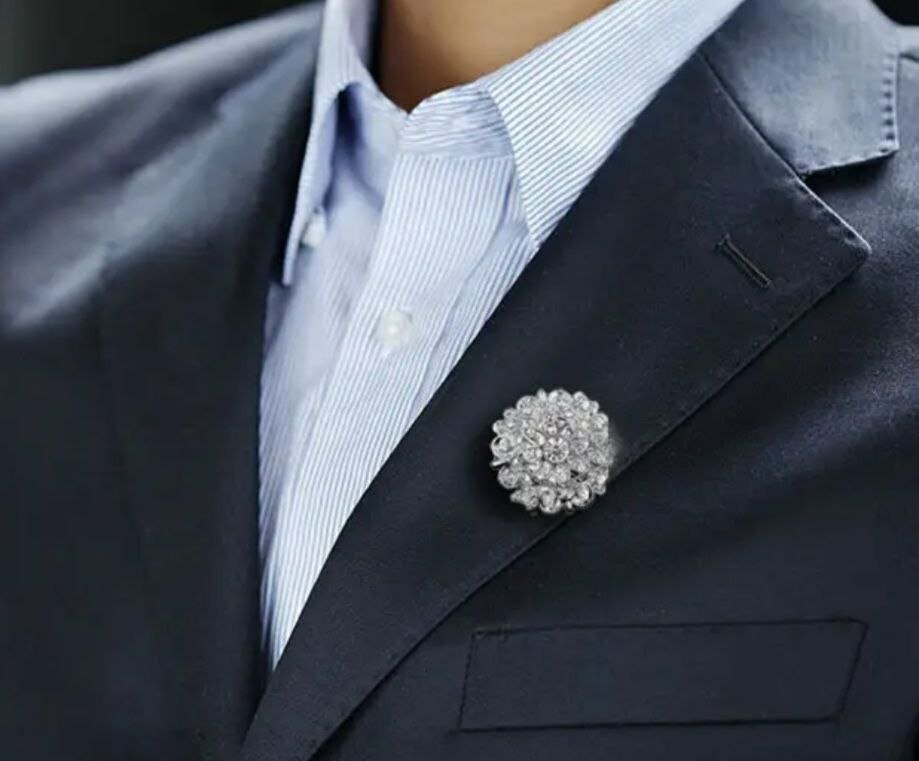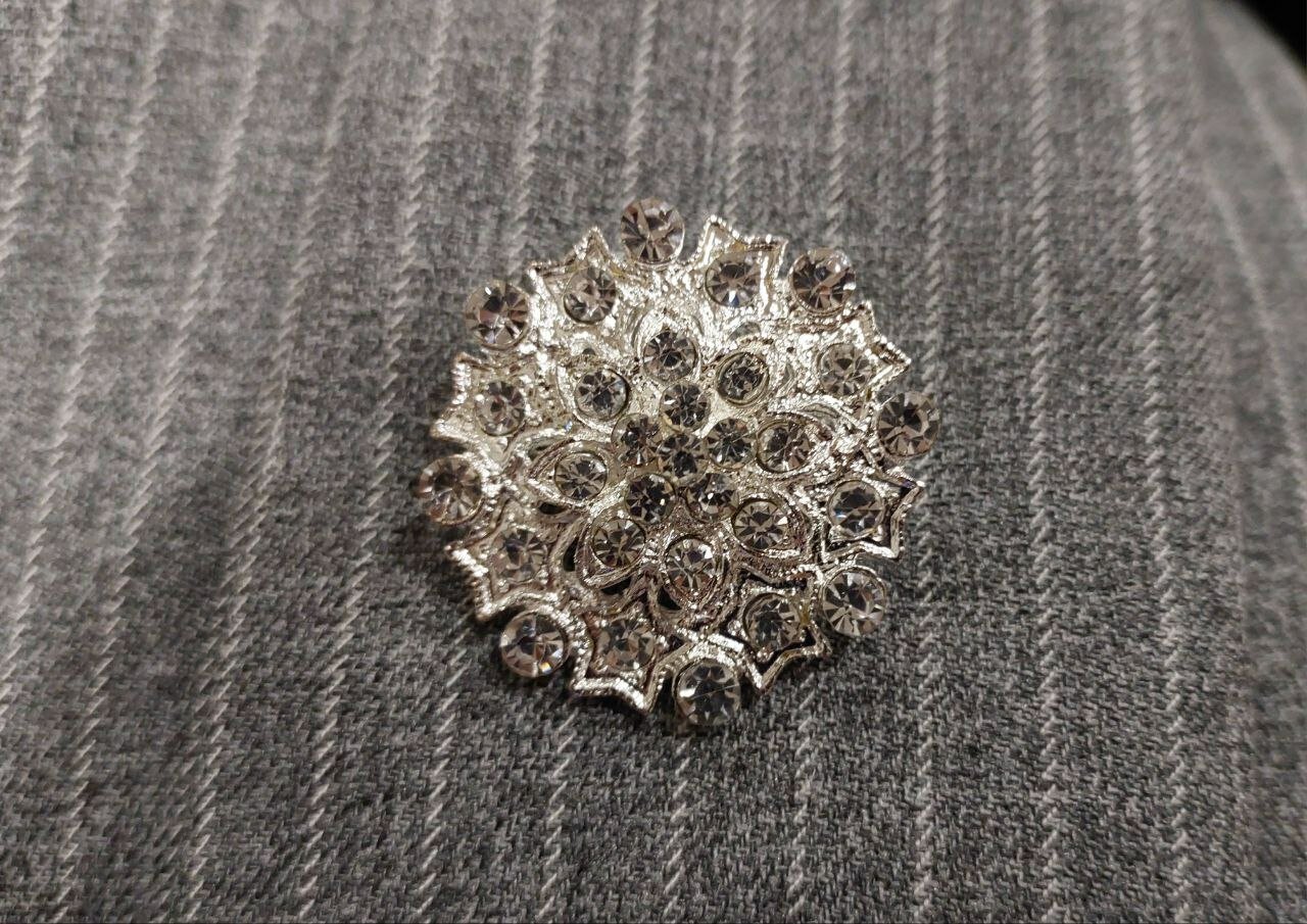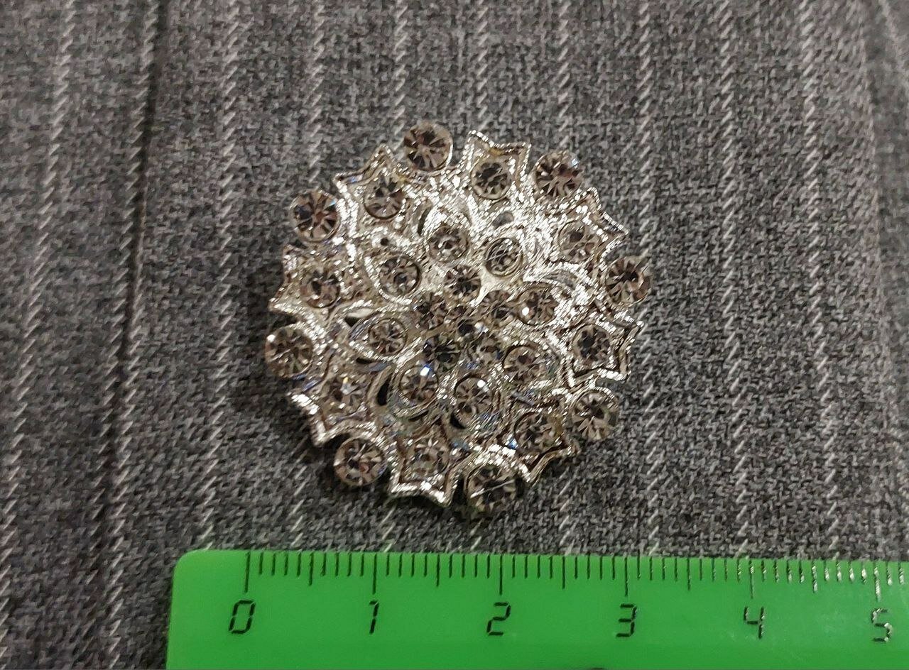 Брошь украшена стразами, которые придают ей блеск и сияние. Благодаря этому, брошь будет выглядеть эффектно и привлекательно на любой одежде.