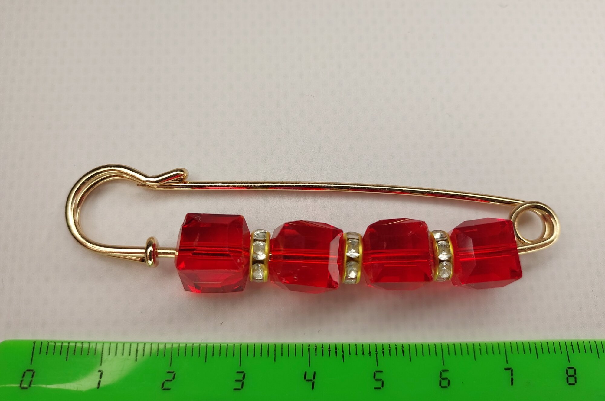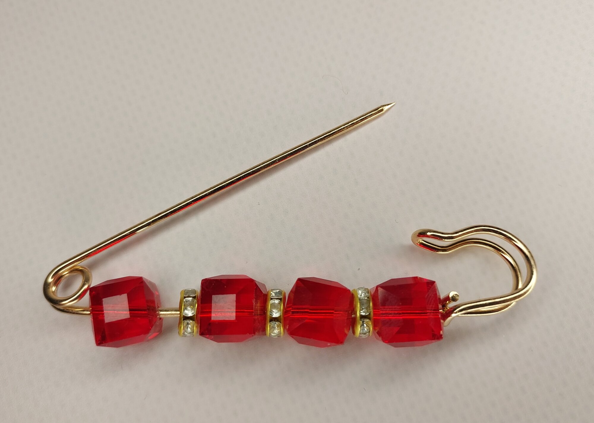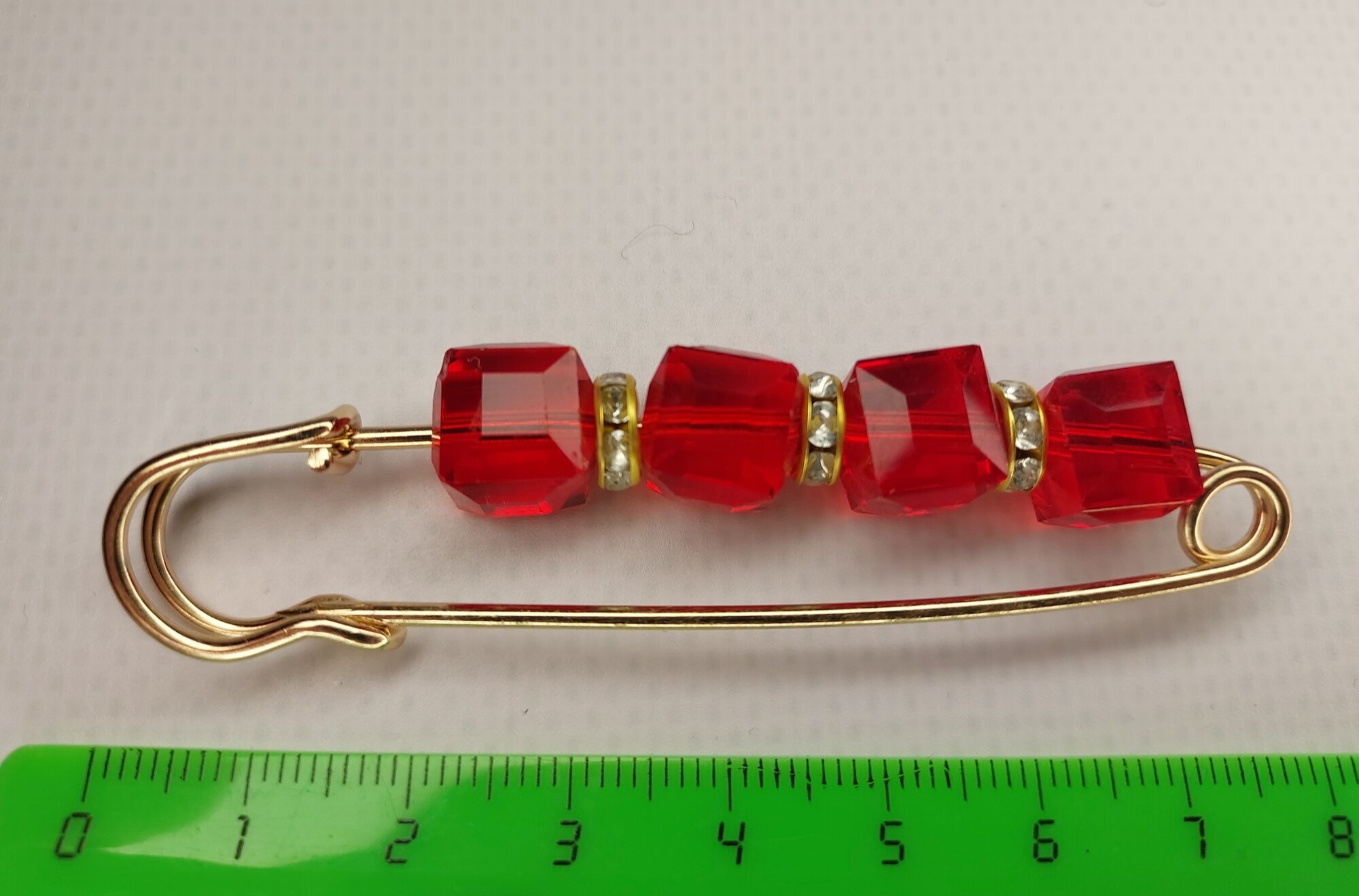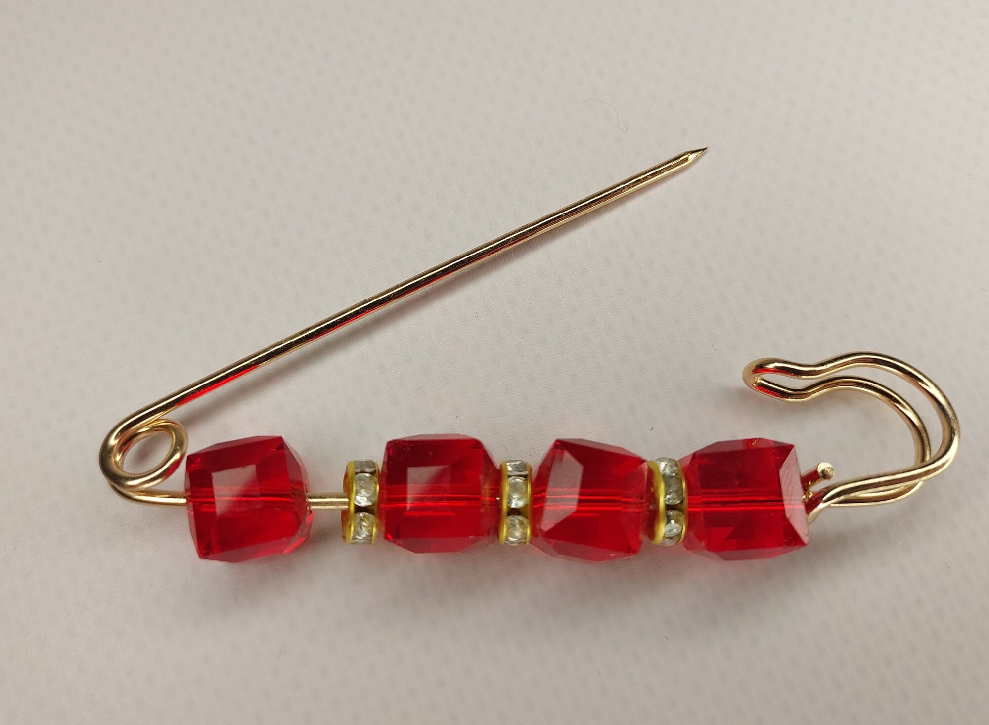 Брошь-булавка "Красные камешки" - это не только стильный аксессуар, но и практичный инструмент для закрепления платков, шарфов и другой одежды.