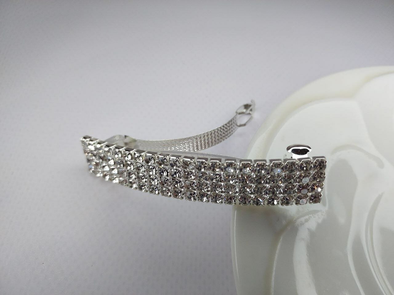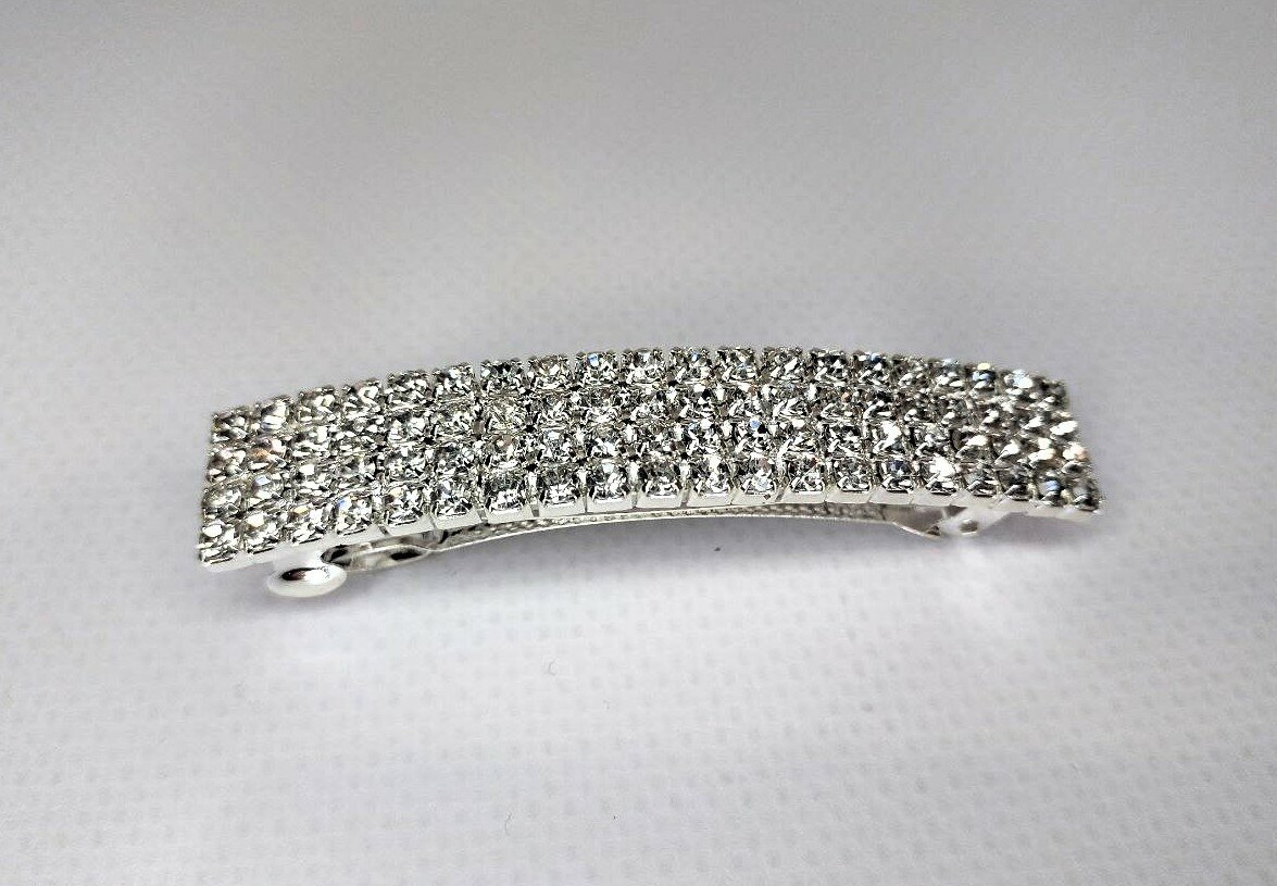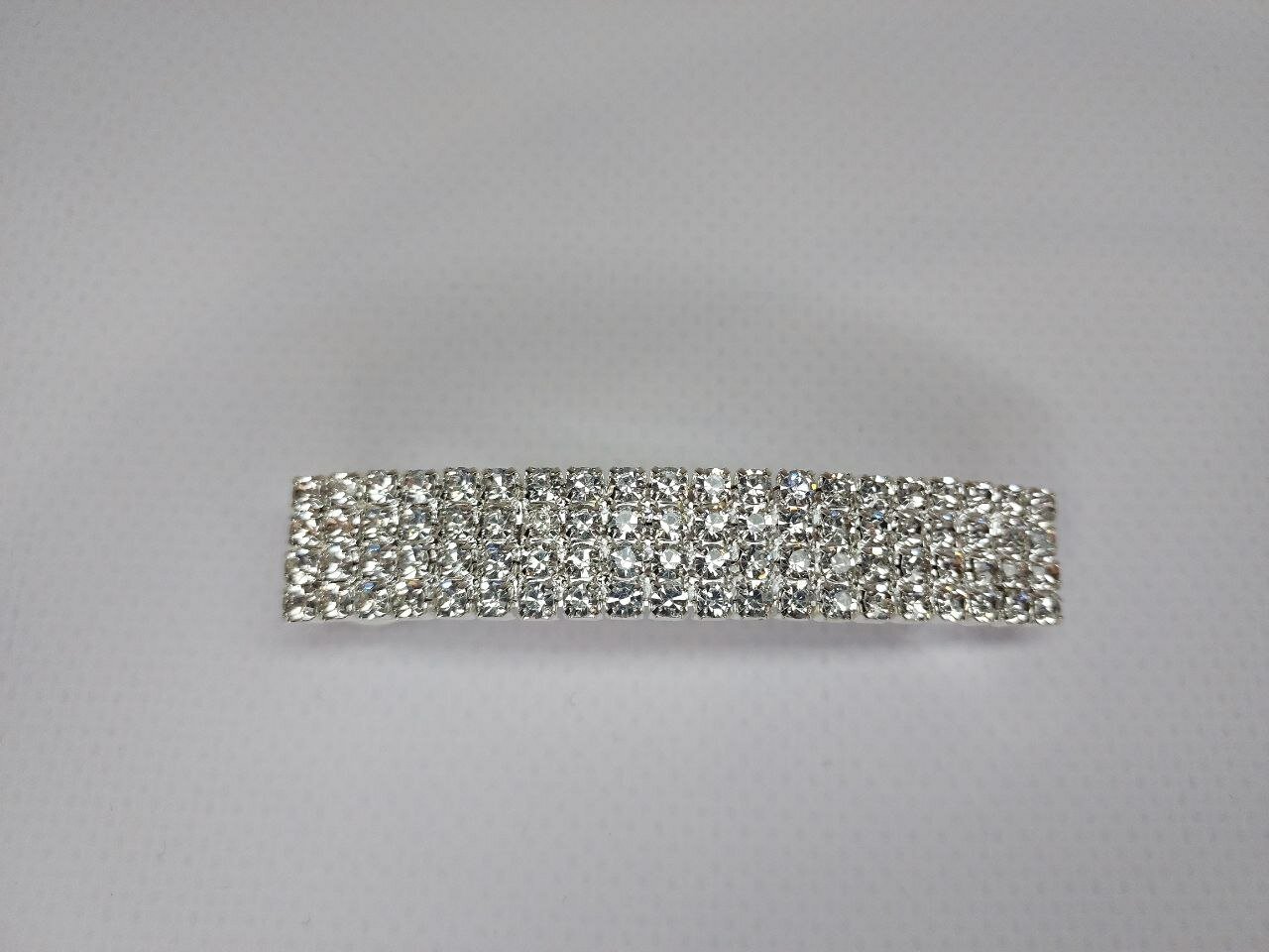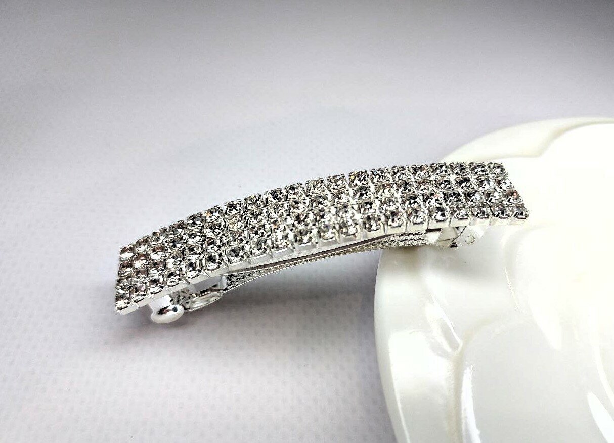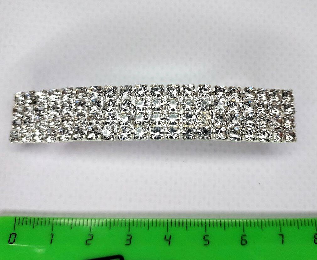 Заколка украшена стразами в четыре ряда, что придает ей изысканный и роскошный вид. Цвет серебро подчеркивает элегантность и стиль аксессуара.