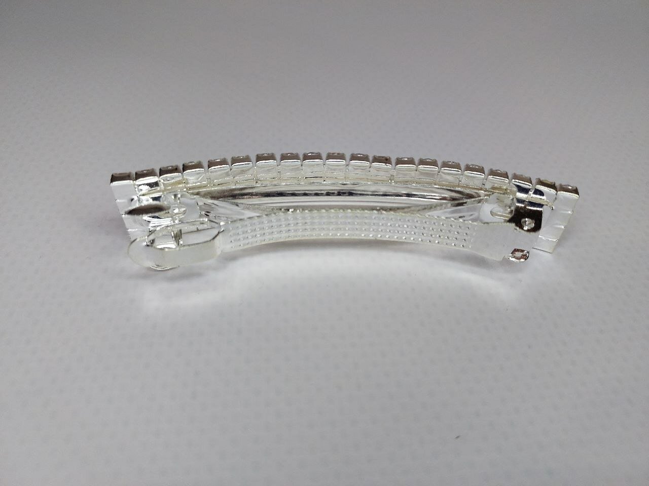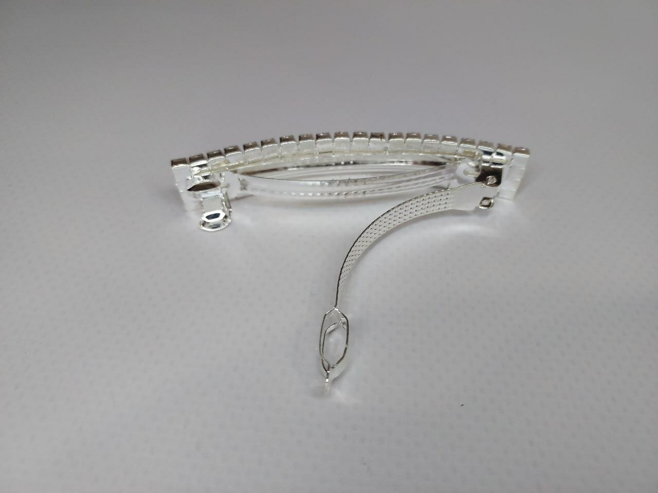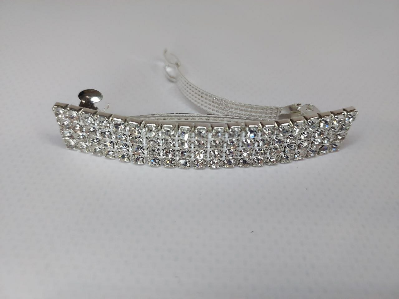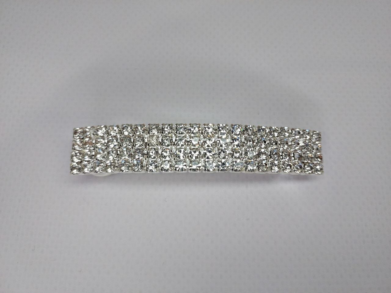 Заколка украшена стразами в четыре ряда, что придает ей изысканный и роскошный вид. Цвет серебро подчеркивает элегантность и стиль аксессуара.