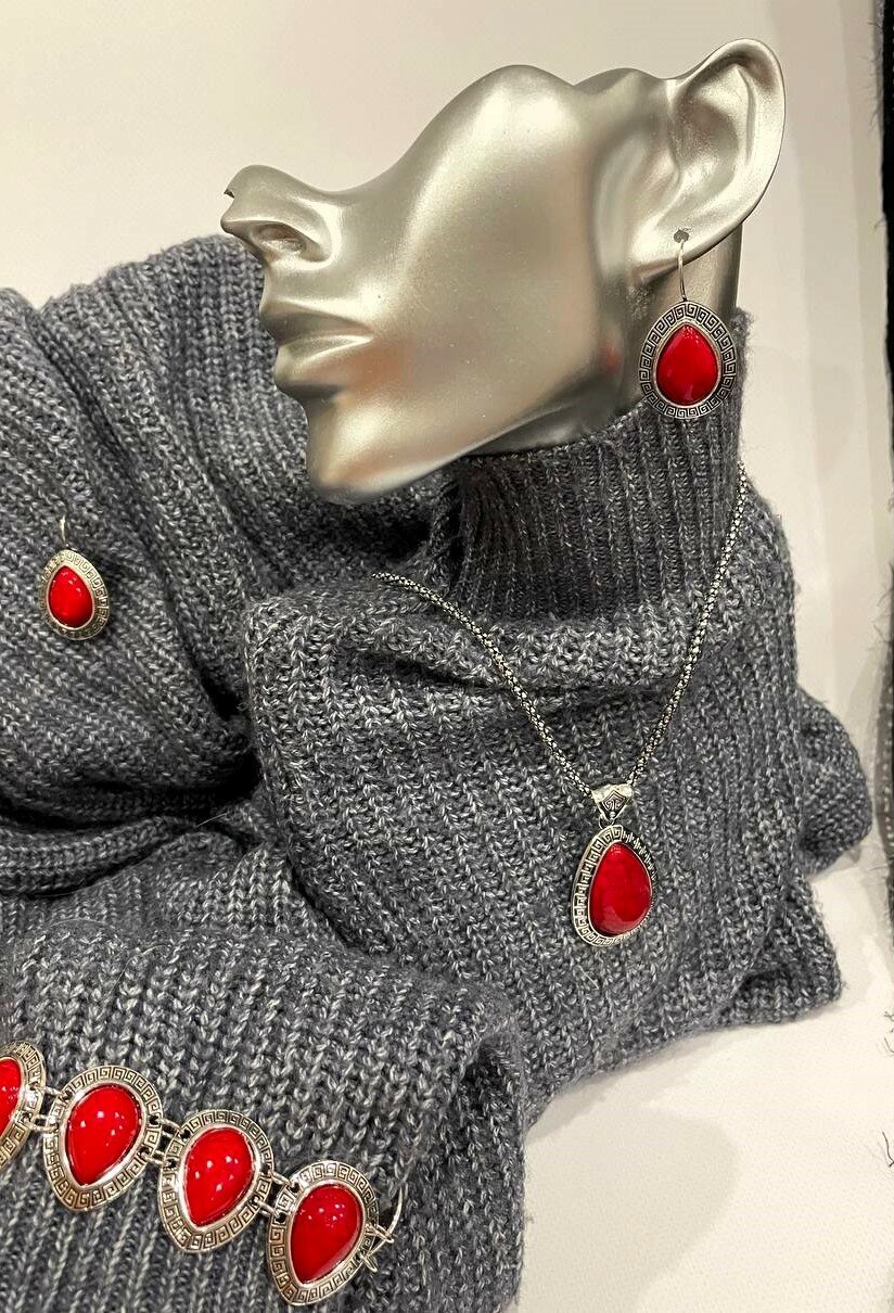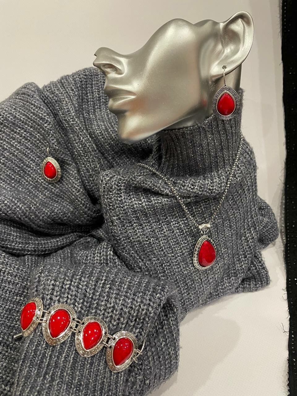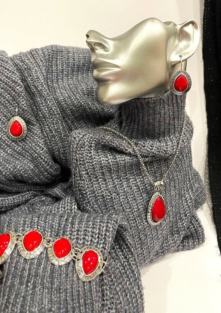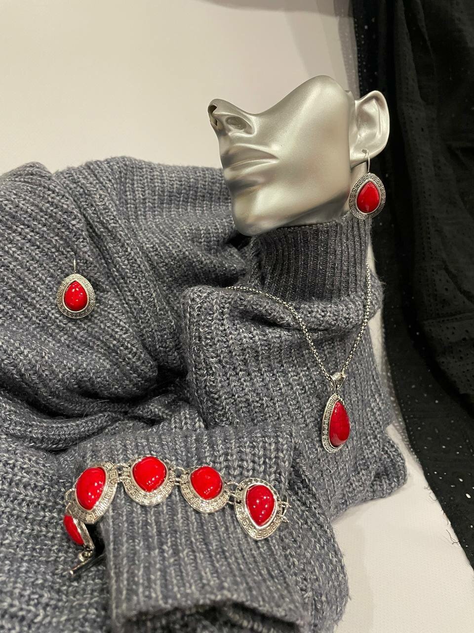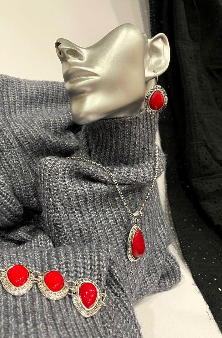 Комплект бижутерии "Красный коралл" представляет собой изысканное сочетание подвески, сережек и браслета, выполненное в форме капли. Этот набор станет прекрасным дополнением к вашему образу и отражением вашего стиля и вкуса.