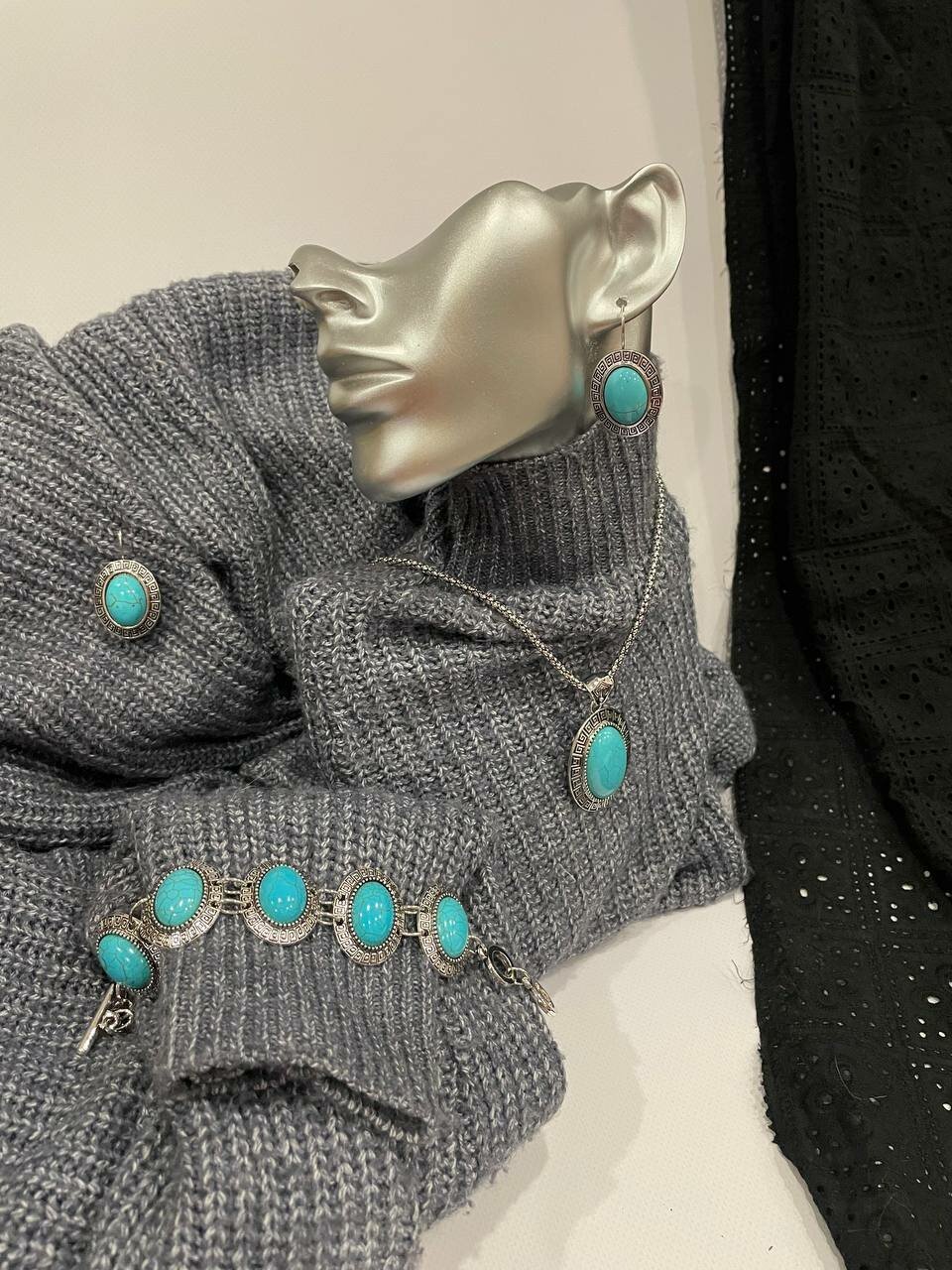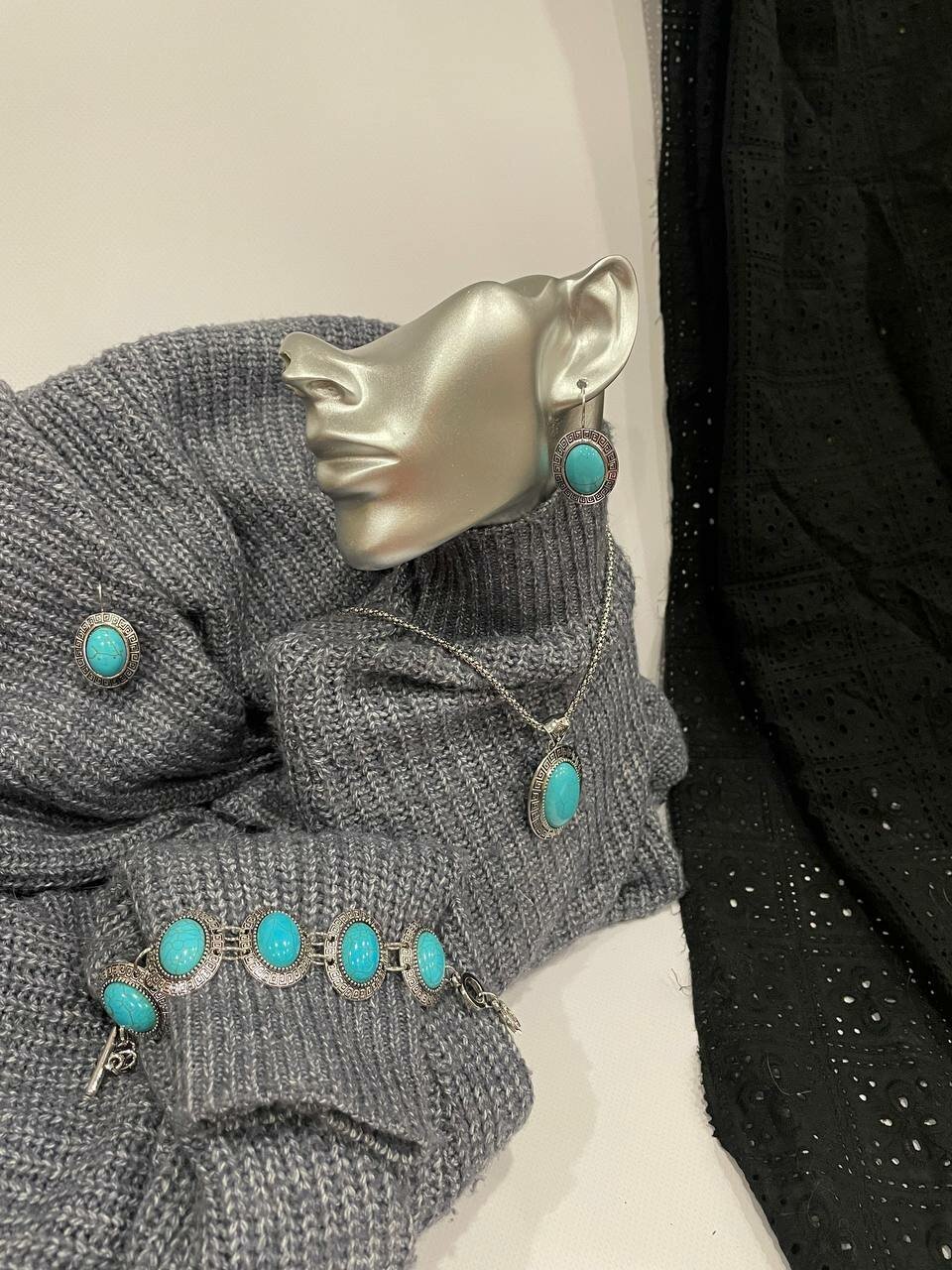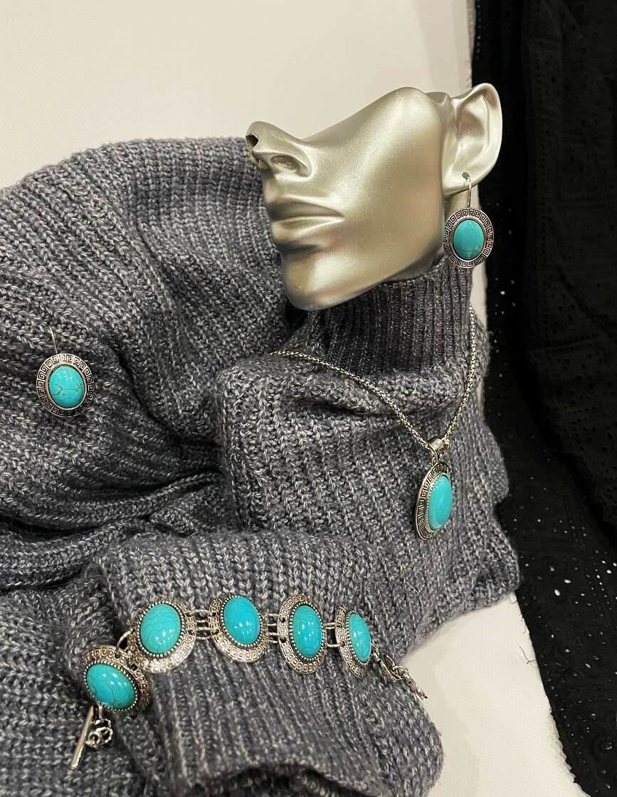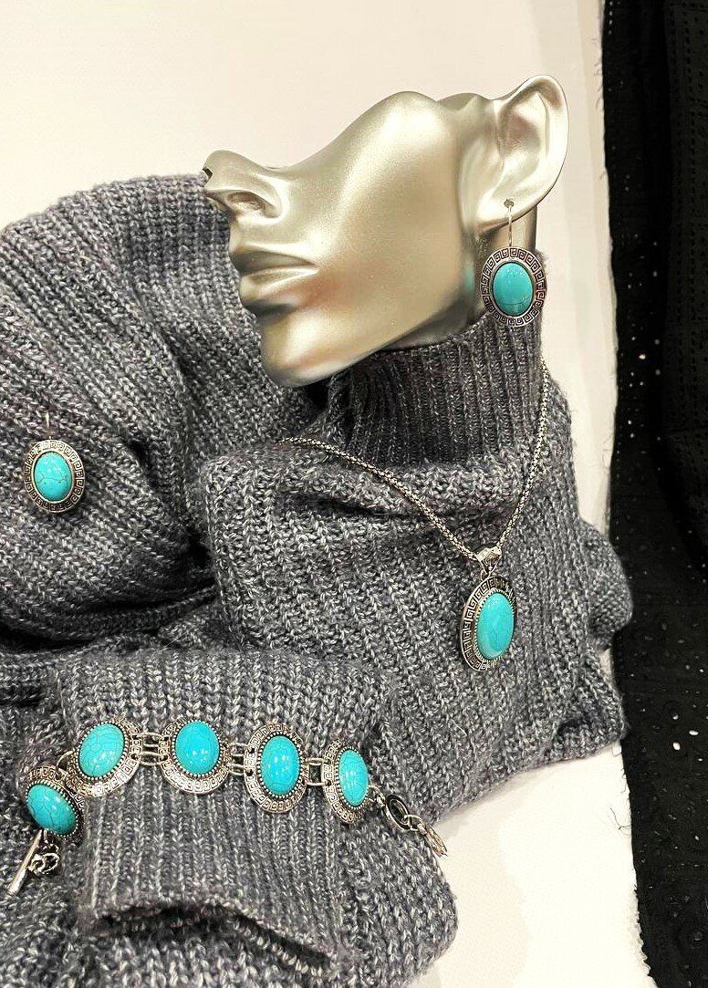 Комплект бижутерии "Бирюза" - это набор украшений, состоящий из подвески, сережек и браслета. Вставки из синтетической бирюзы придают украшениям яркость и элегантность, делая их прекрасным дополнением к зимнему образу.