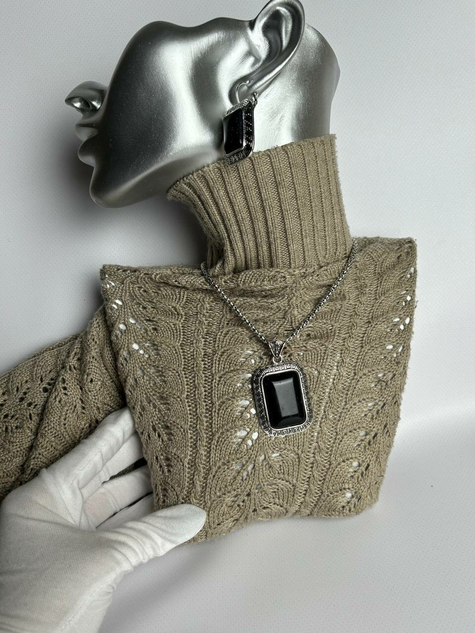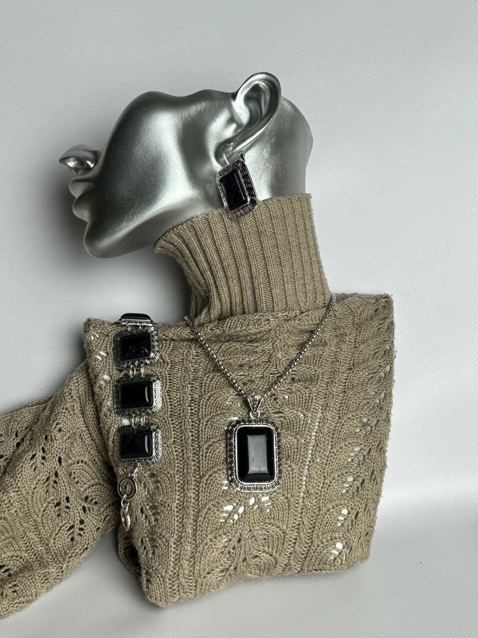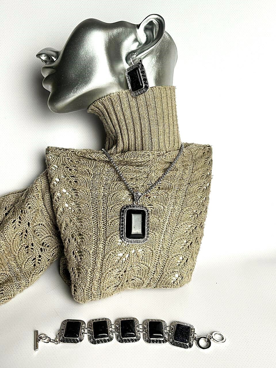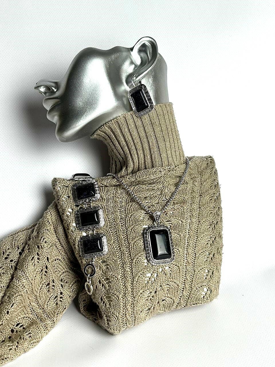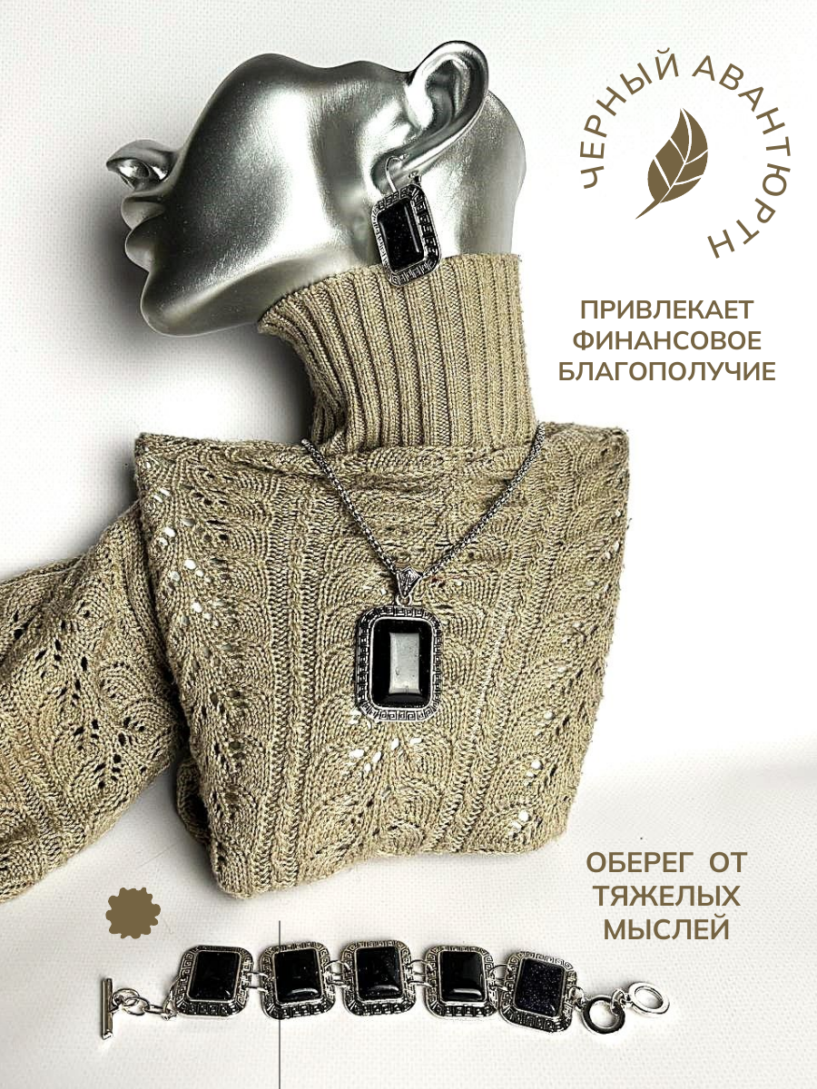 Набор Черный авантюрин (натуральный камень) комплект украшений, состоящий из подвески, сережек и браслета.