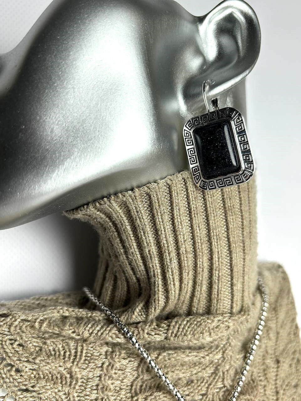 Вставки из черного авантюрина смотрятся ярко и элегантно. Авантюрин с древних времен привлекал внимание магов и экстрасенсов, так как яркое мерцание этого самоцвета – не только необыкновенно красиво, но и имеет огромную магическую и лечебную силу. Также камень способен защитить человека от колдовства, зла и алчности. Было замечено, что камень помогает очистить сознание человека от нервных расстройств, тяжелых тревожных мыслей, удерживает от неправильных поступков