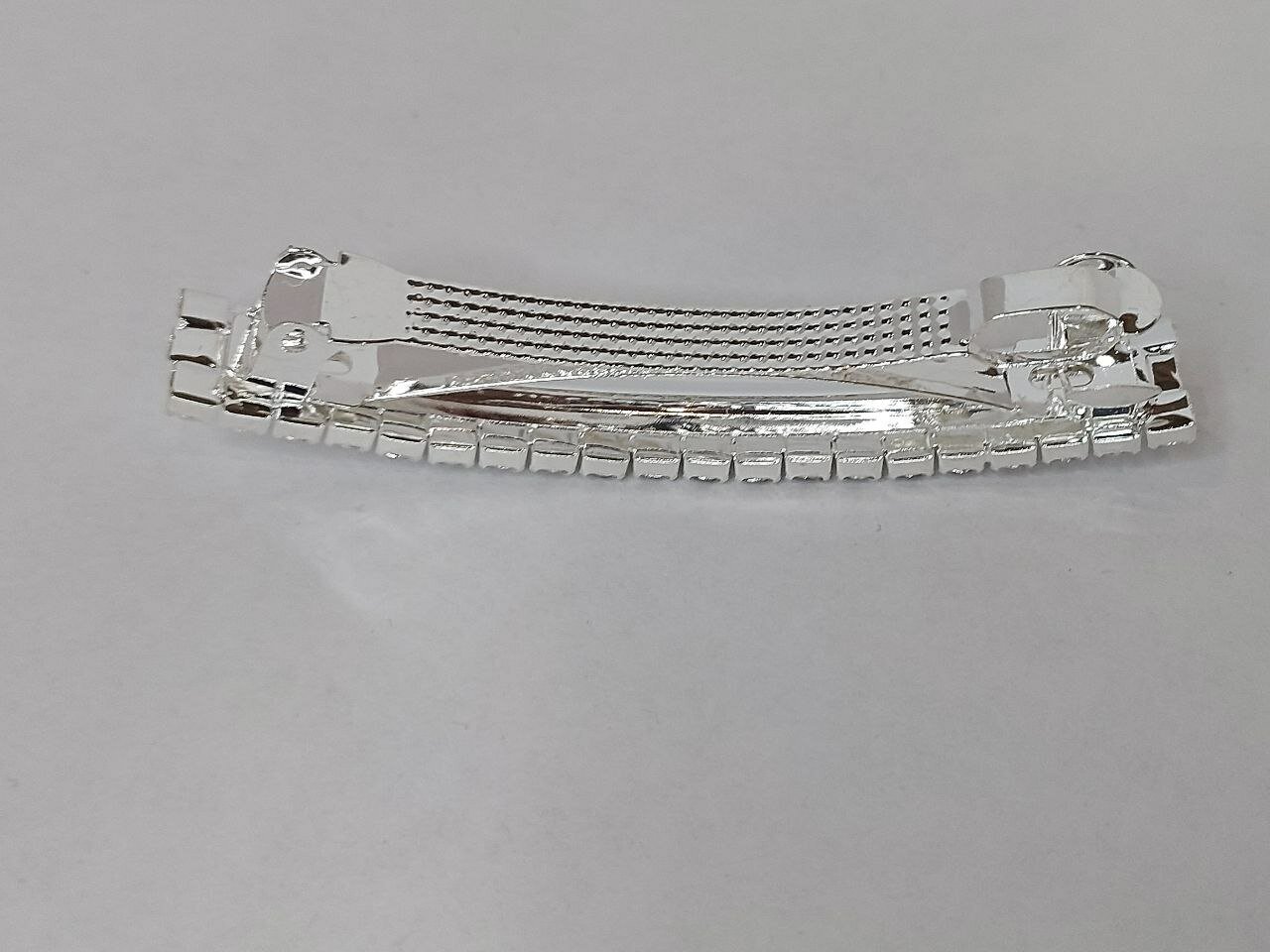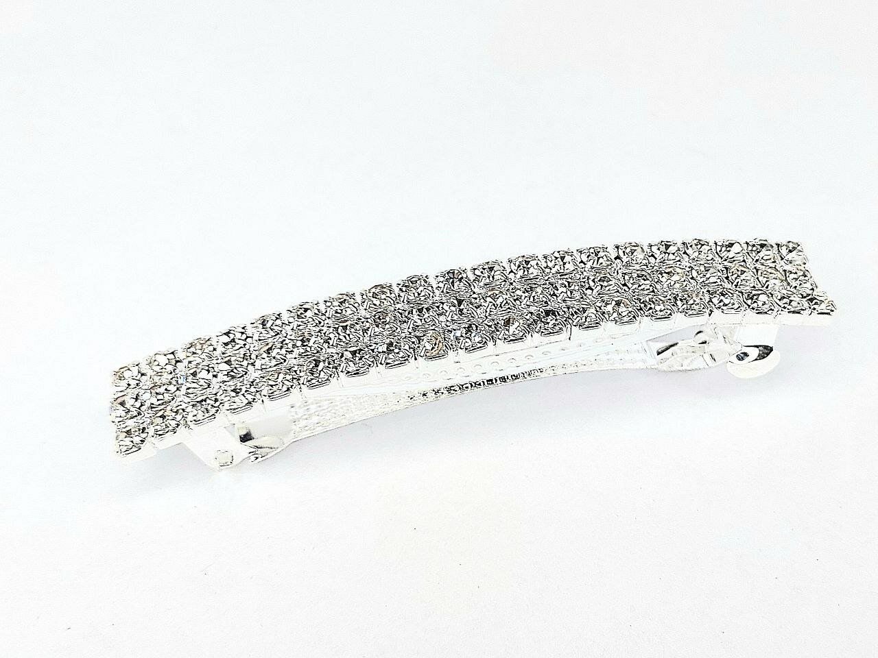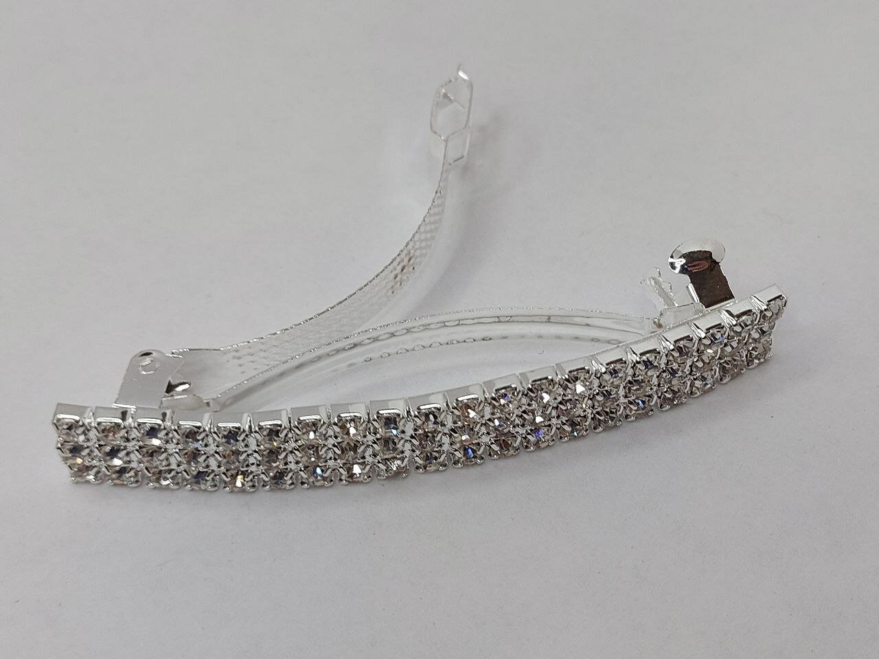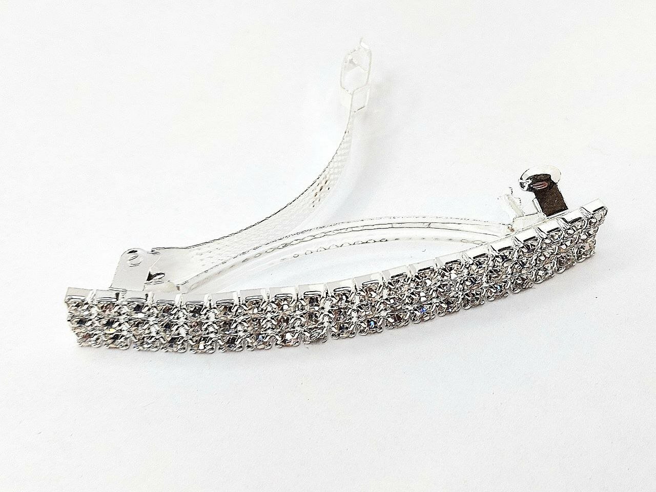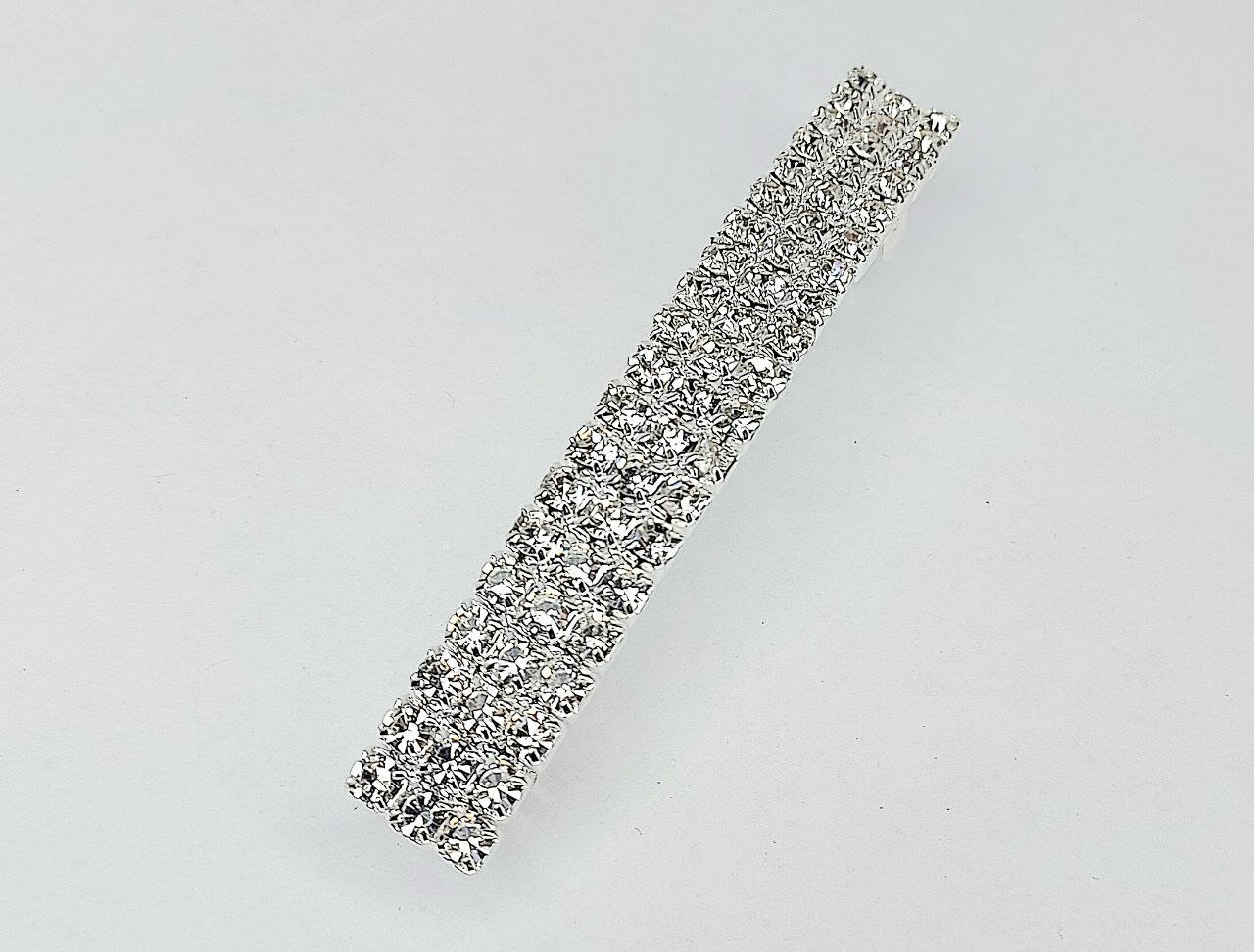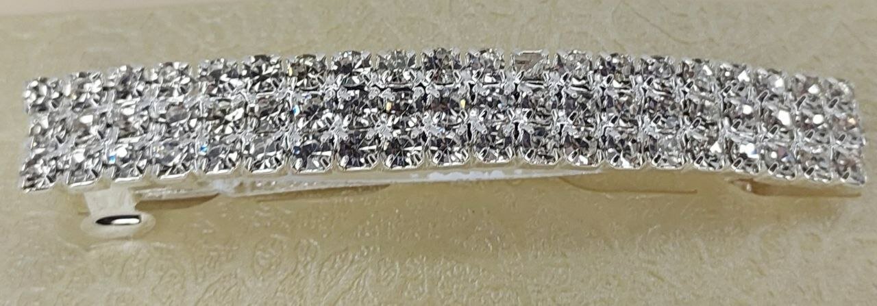 Заколка украшена стразами в три ряда, что придает ей роскошный и стильный вид. Цвет заколки – серебристый, что делает ее подходящей для любого образа и цвета волос.