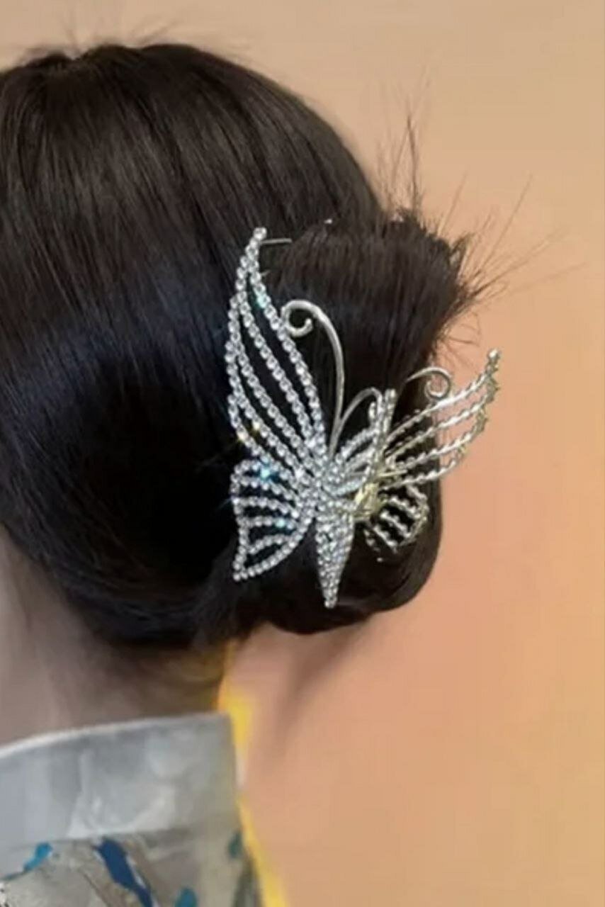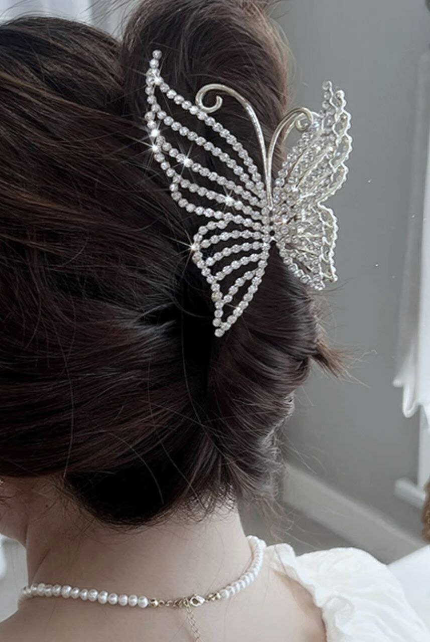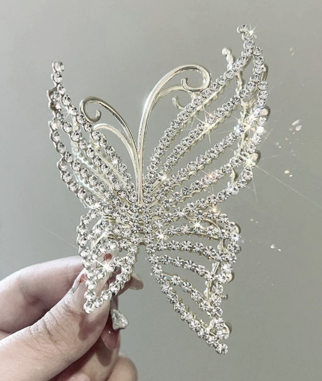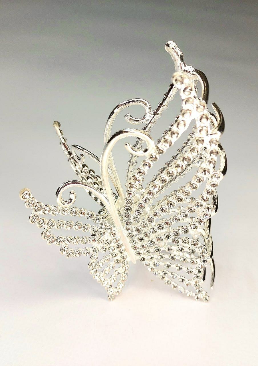 Заколка-краб "бабочка" инкрустированная стразами доступна в различных цветах, включая серебристый, белый и серый.