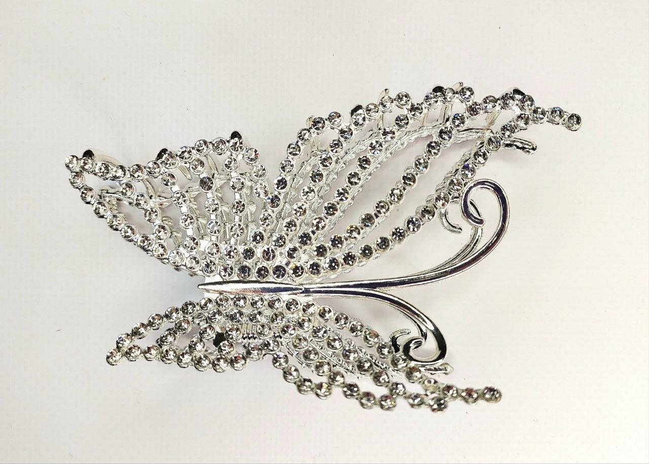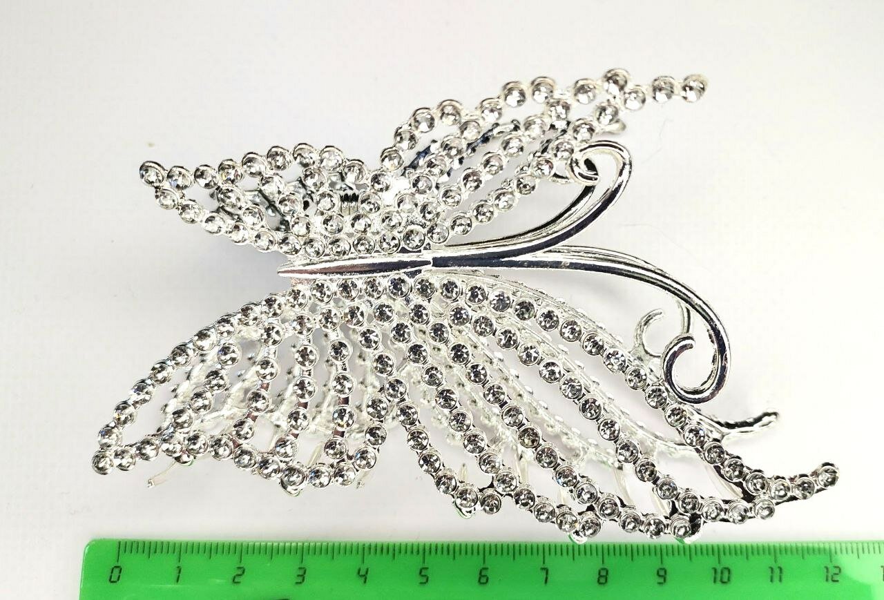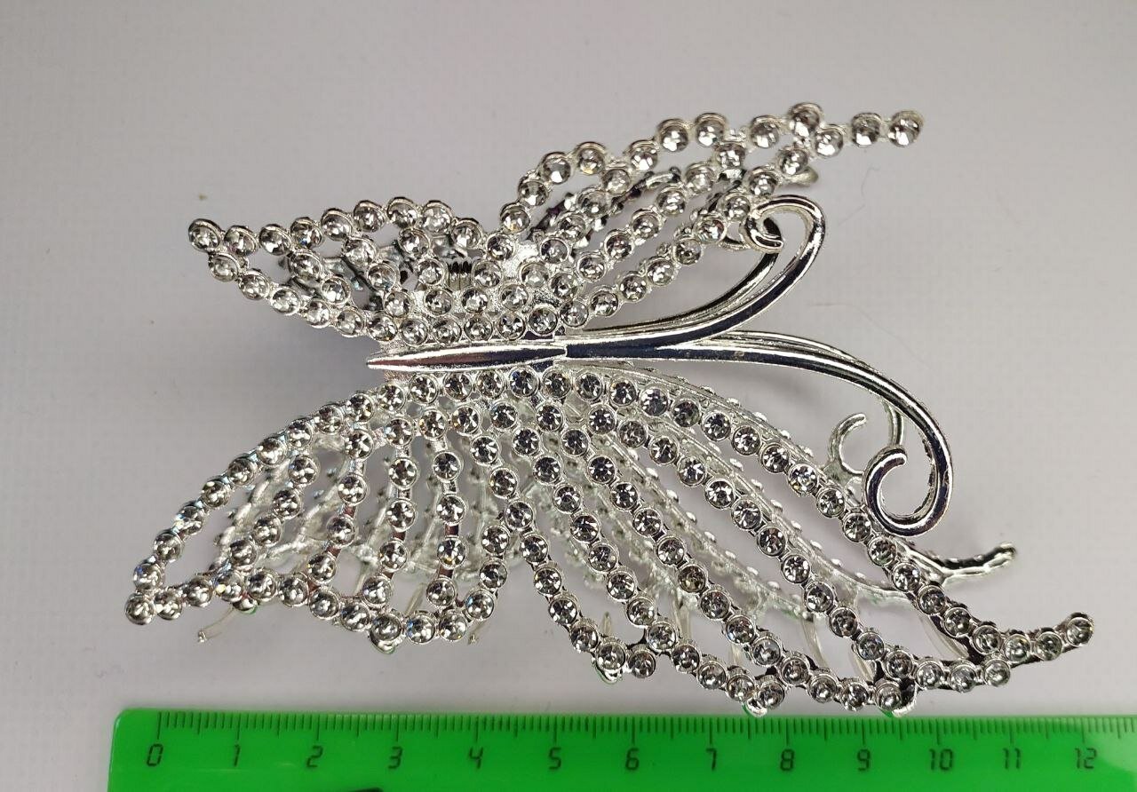 Заколка-краб "бабочка" инкрустированная стразами станет прекрасным дополнением к вашему образу. Изящная заколка с серебристым цветом и декором из страз добавит женственности и блеска вашим волосам.
