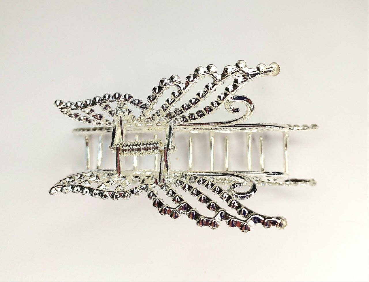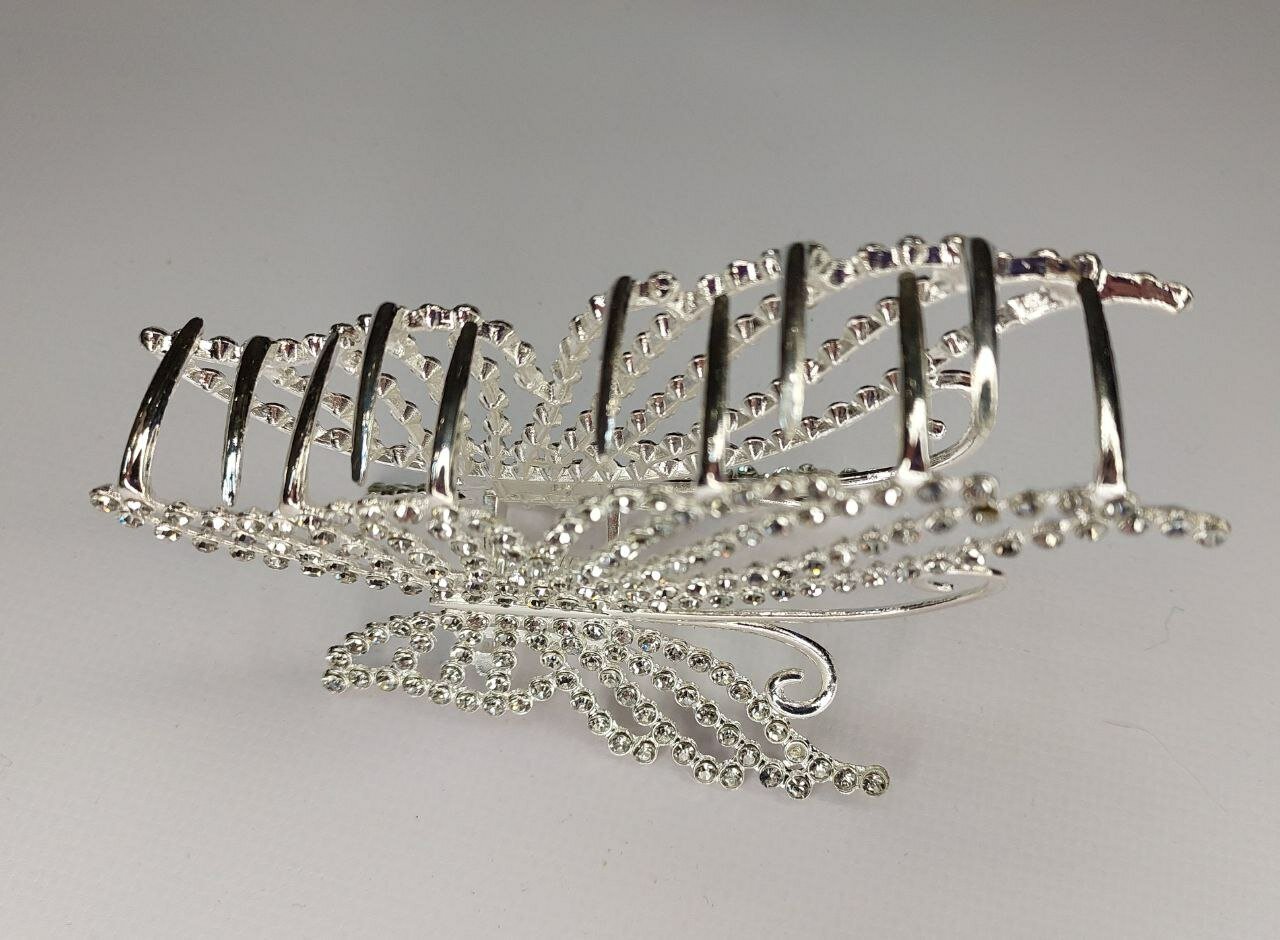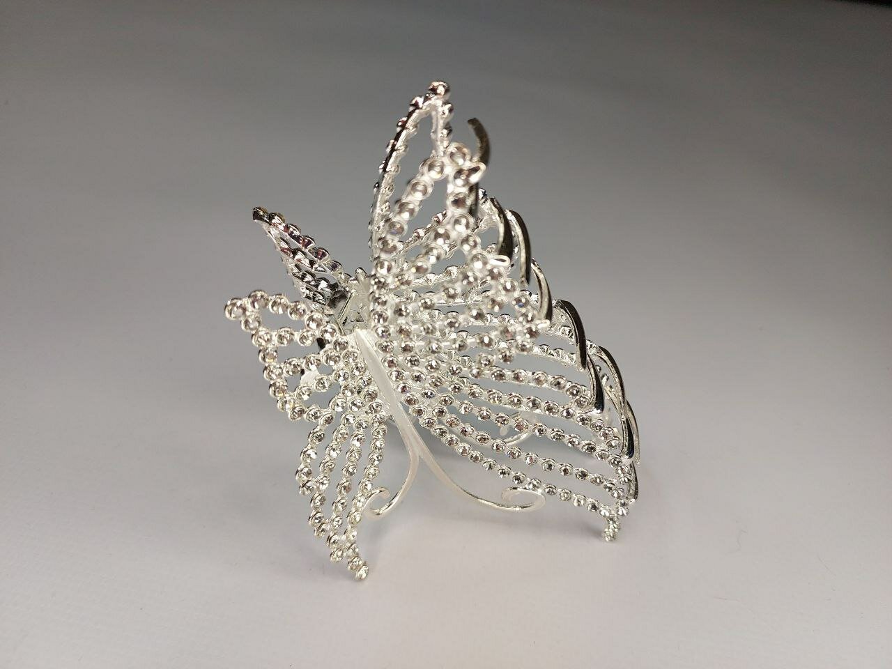 Заколка-краб "бабочка" инкрустированная стразами станет прекрасным дополнением к вашему образу. Изящная заколка с серебристым цветом и декором из страз добавит женственности и блеска вашим волосам.