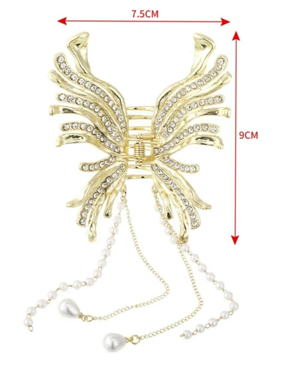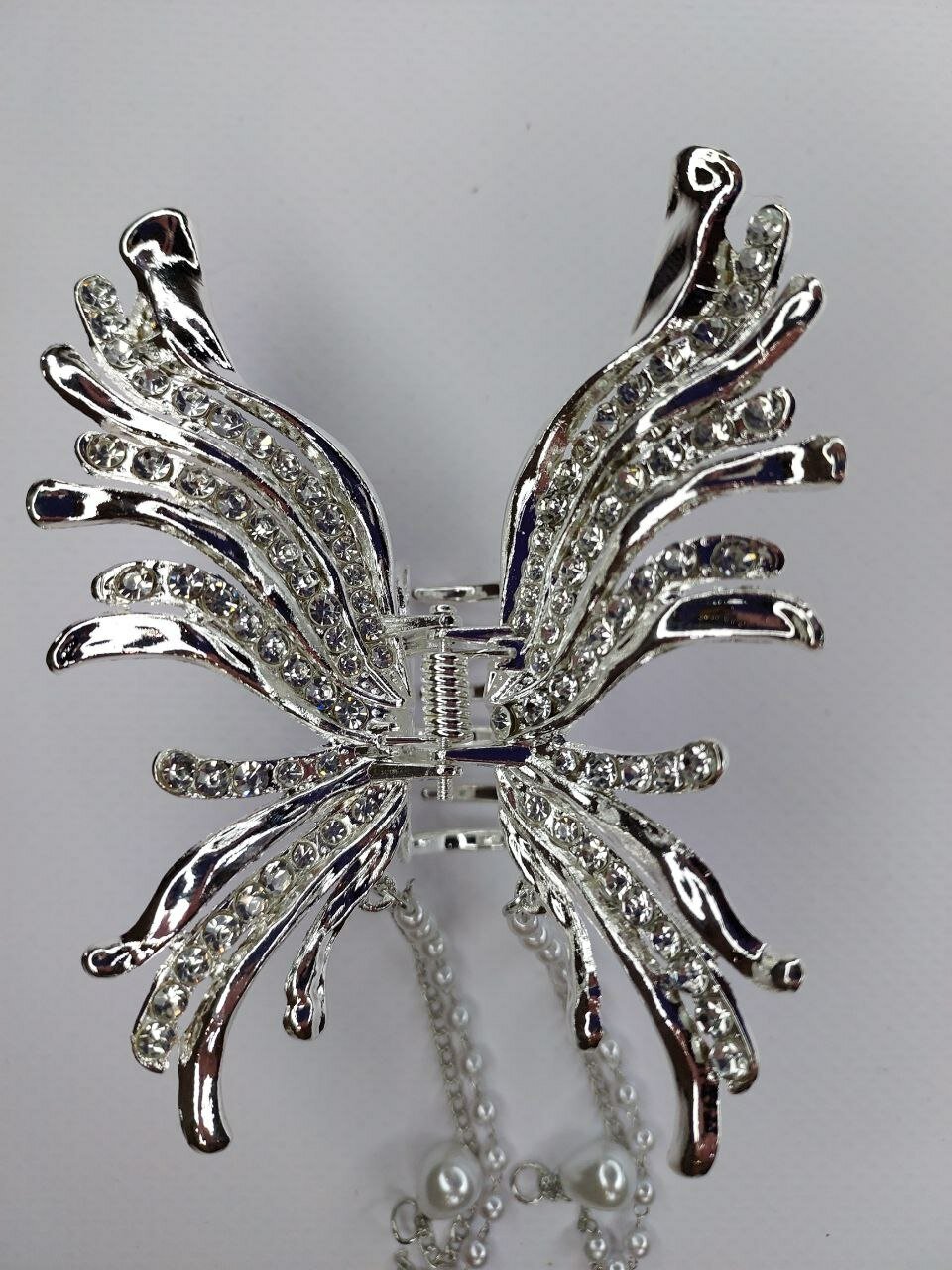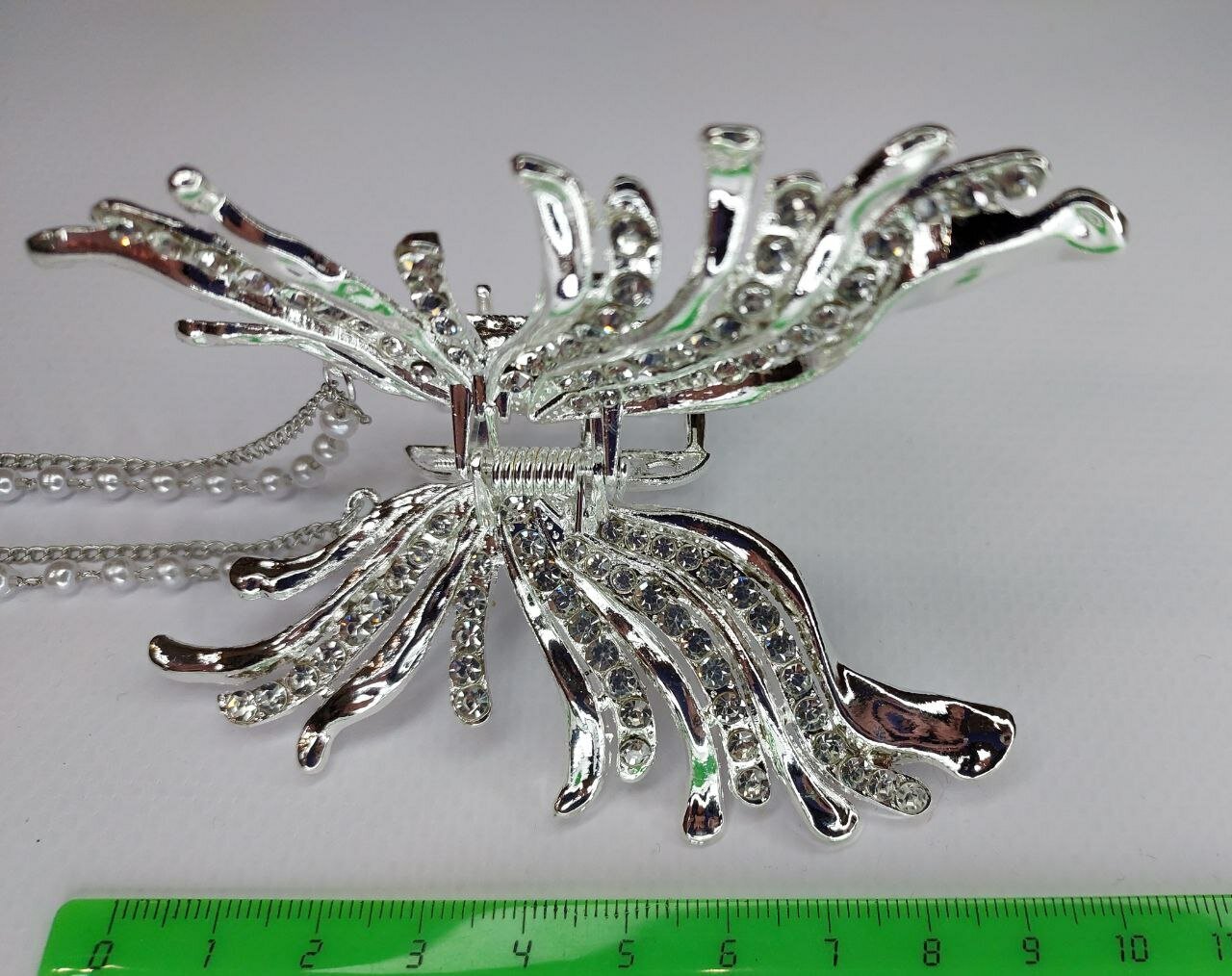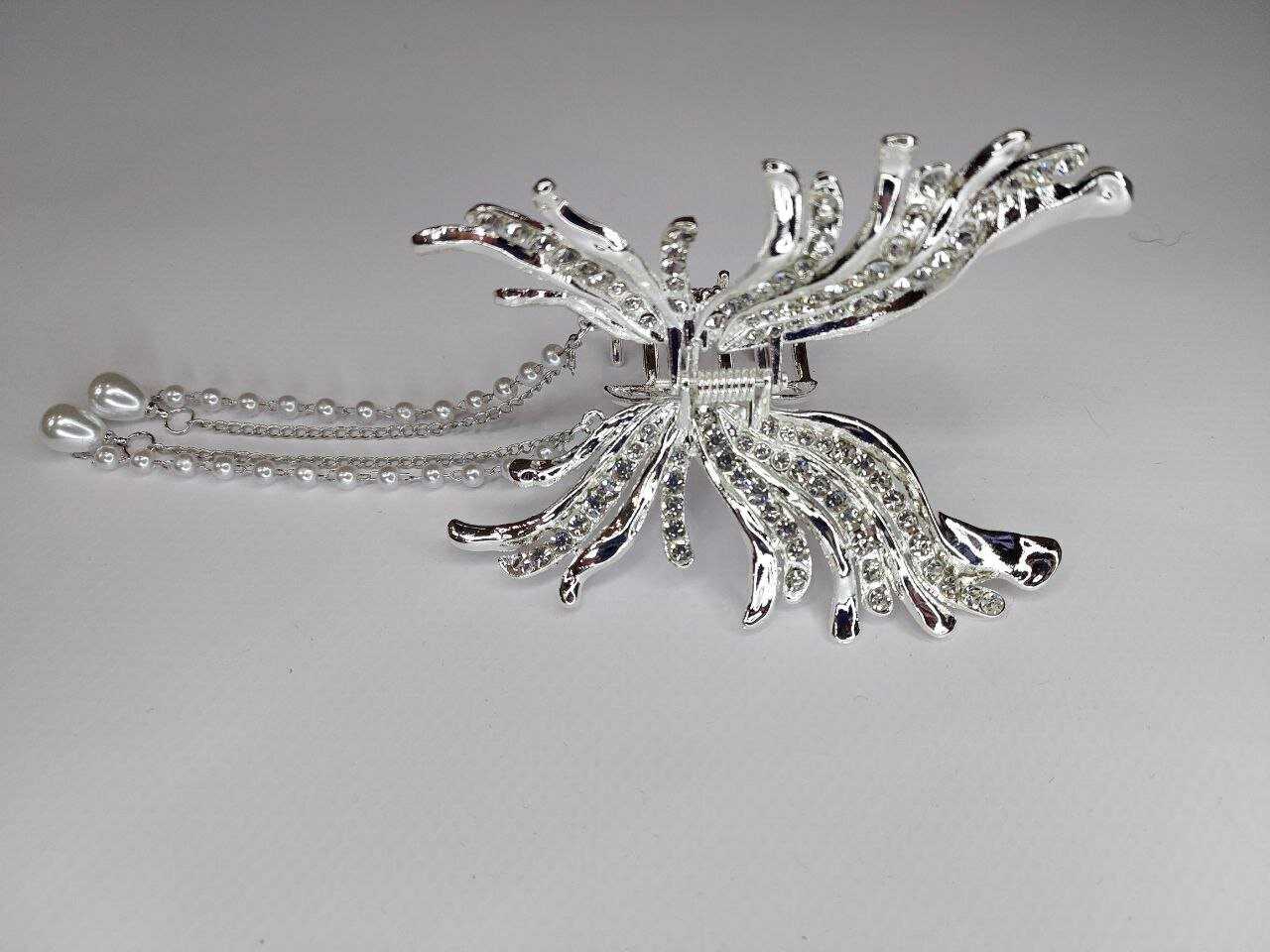 Заколка-краб для волос в виде бабочки с подвесками из жемчужин (имитация) и кристаллами.