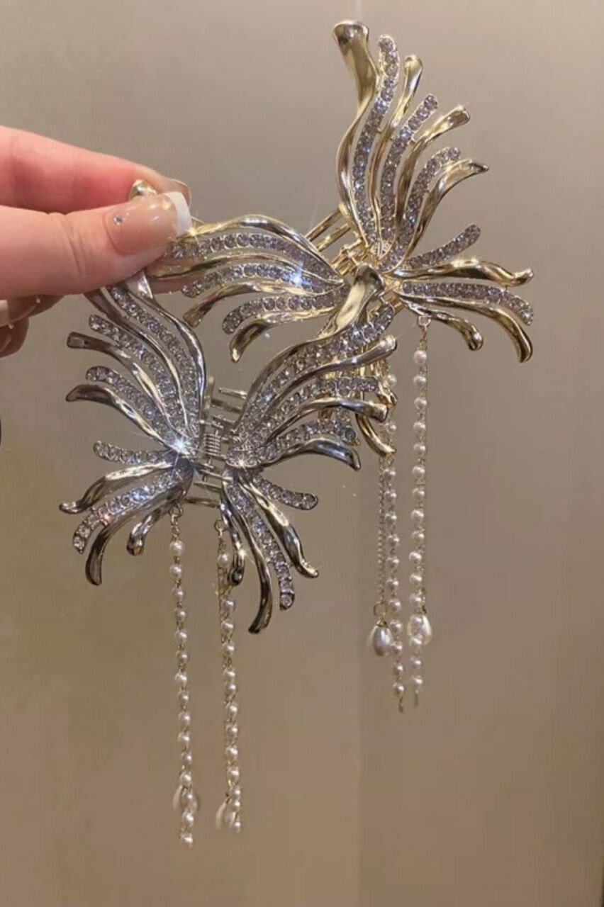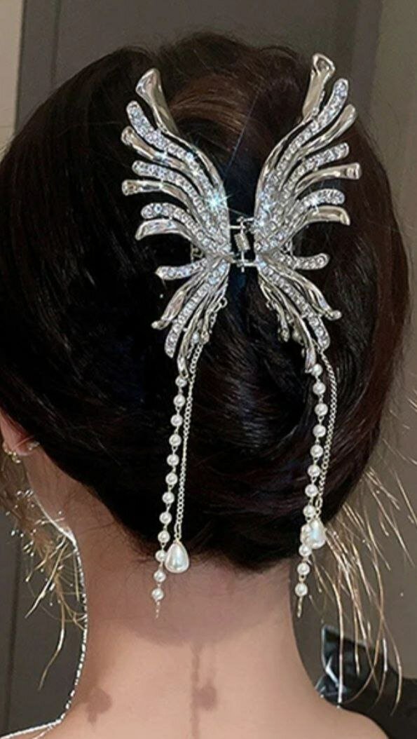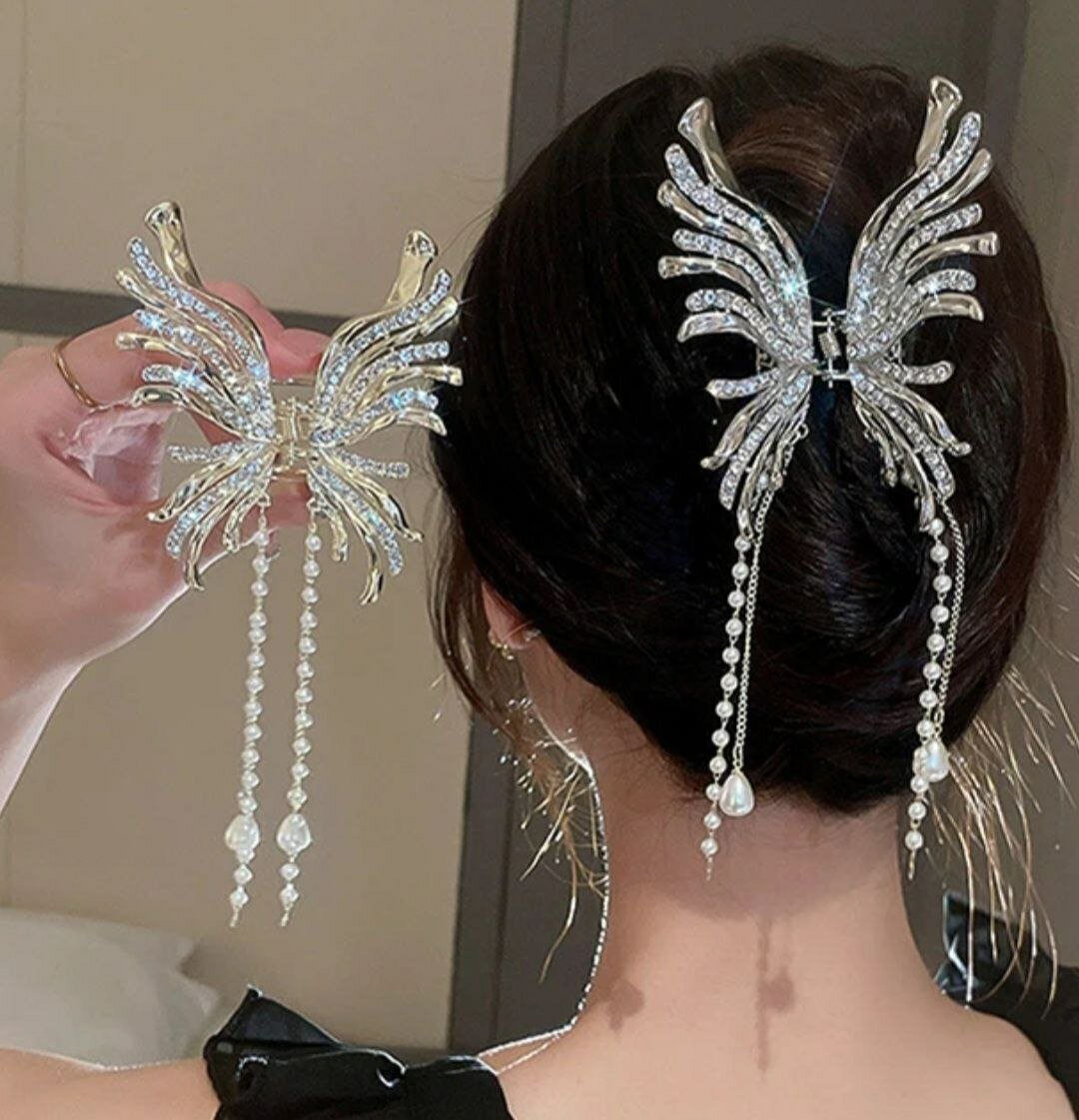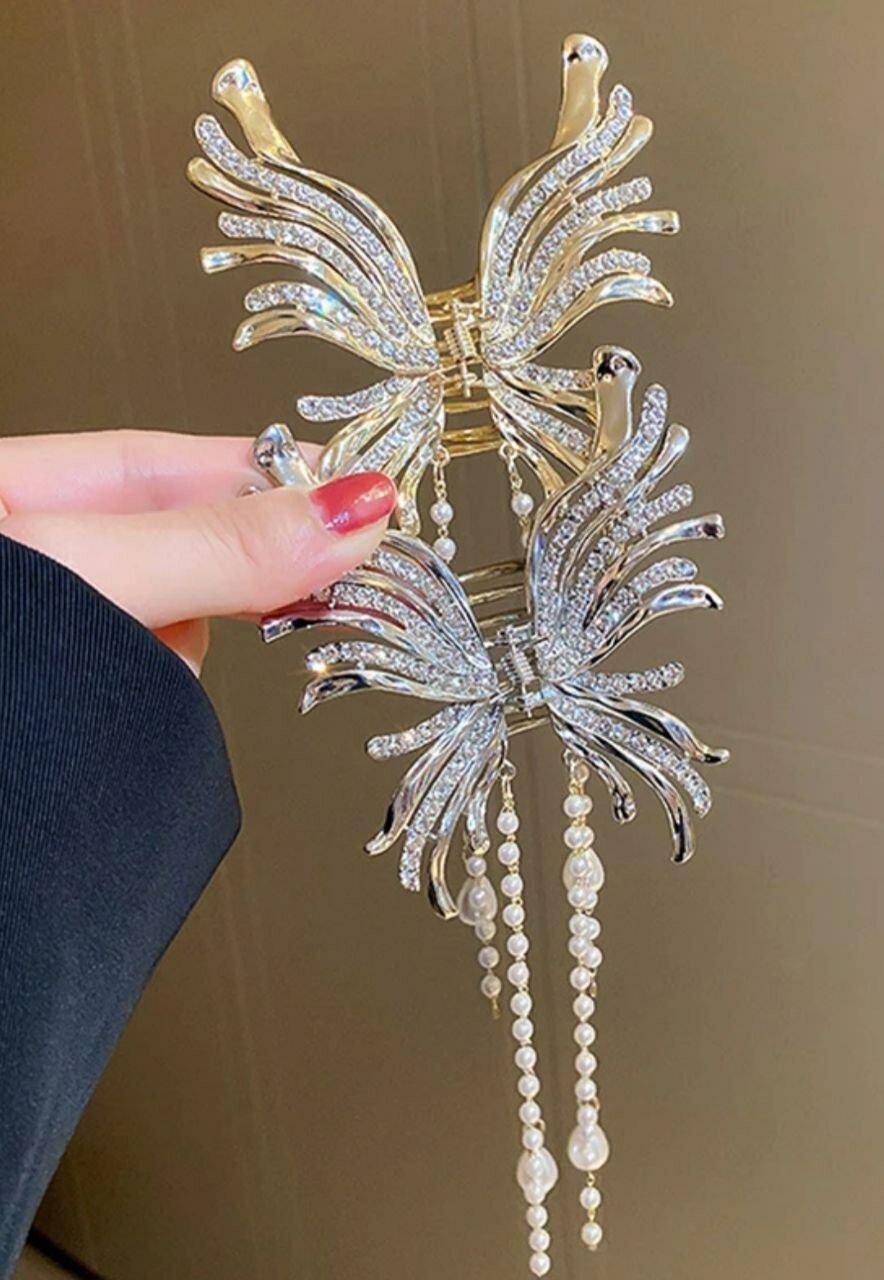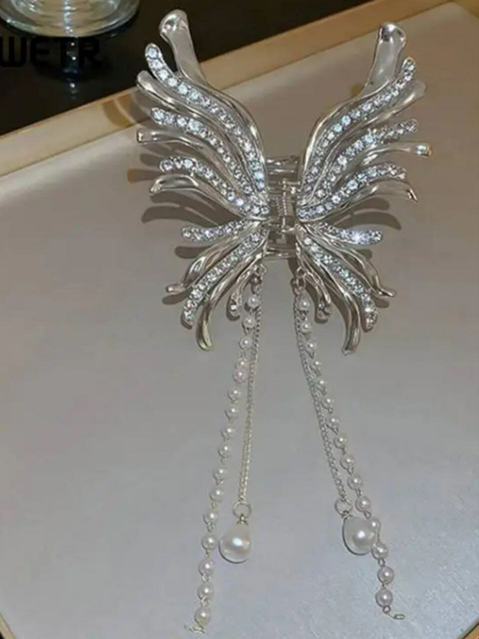 Заколка-краб для волос в виде бабочки с подвесками из жемчужин (имитация) и кристаллами.