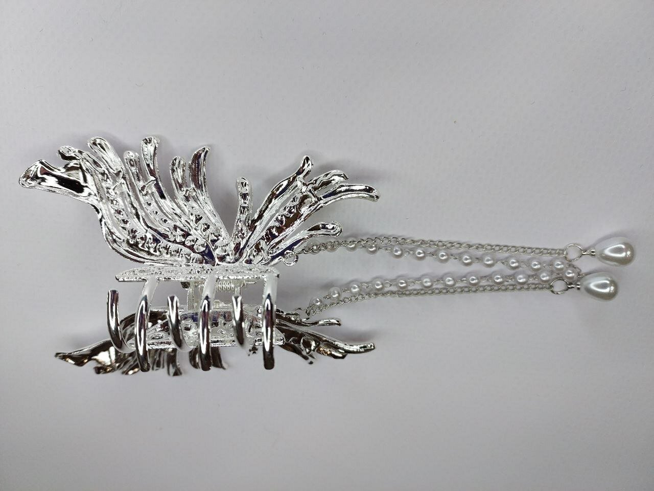 Заколка выполнена из качественного металла, что гарантирует ее долговечность и надежность. Цвет заколки – серебристый, что придает ей элегантный и стильный вид.
