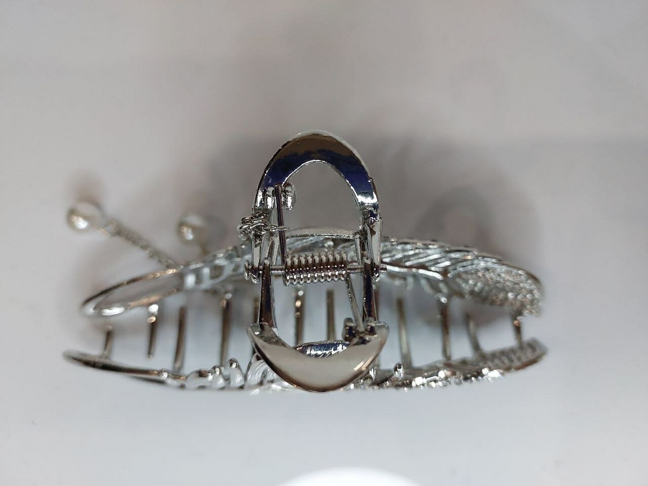 Заколка выполнена в форме краба, что обеспечивает надежное крепление волос и позволяет создавать разнообразные прически. Материал заколки - металл, что гарантирует долговечность и прочность аксессуара.