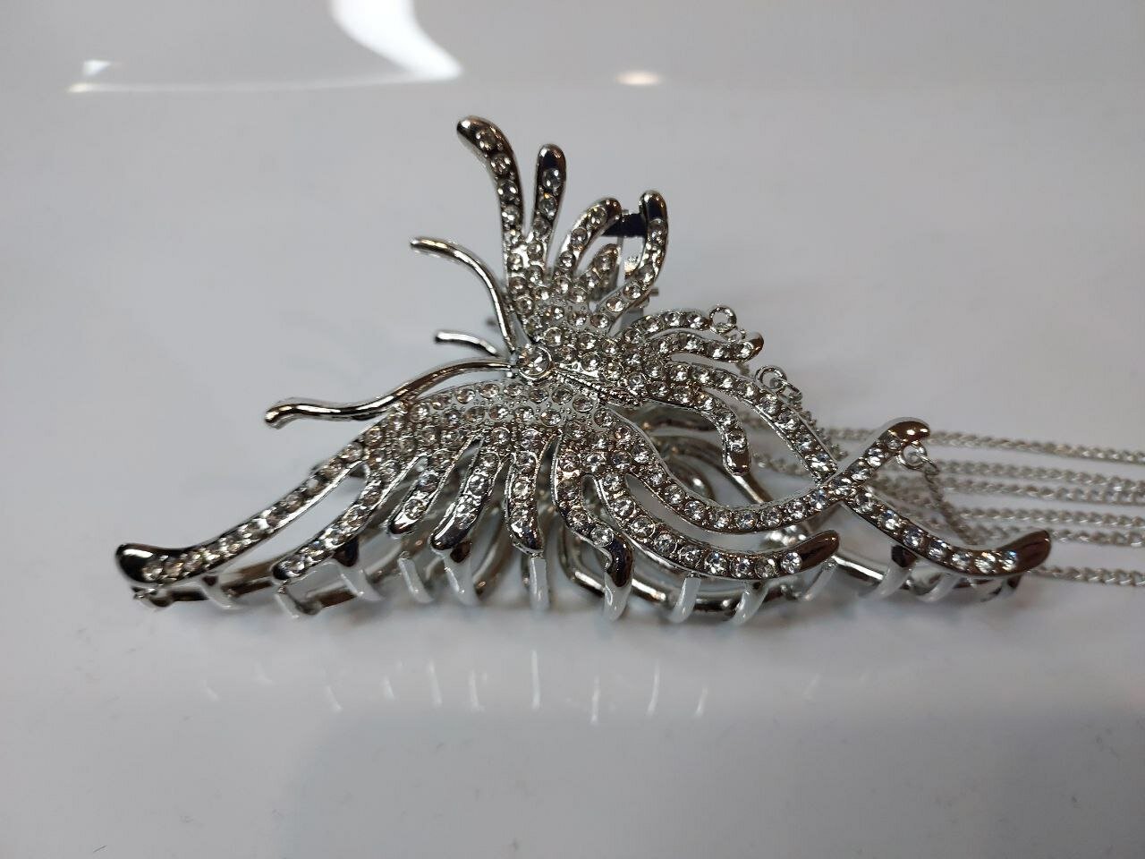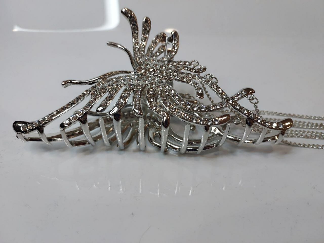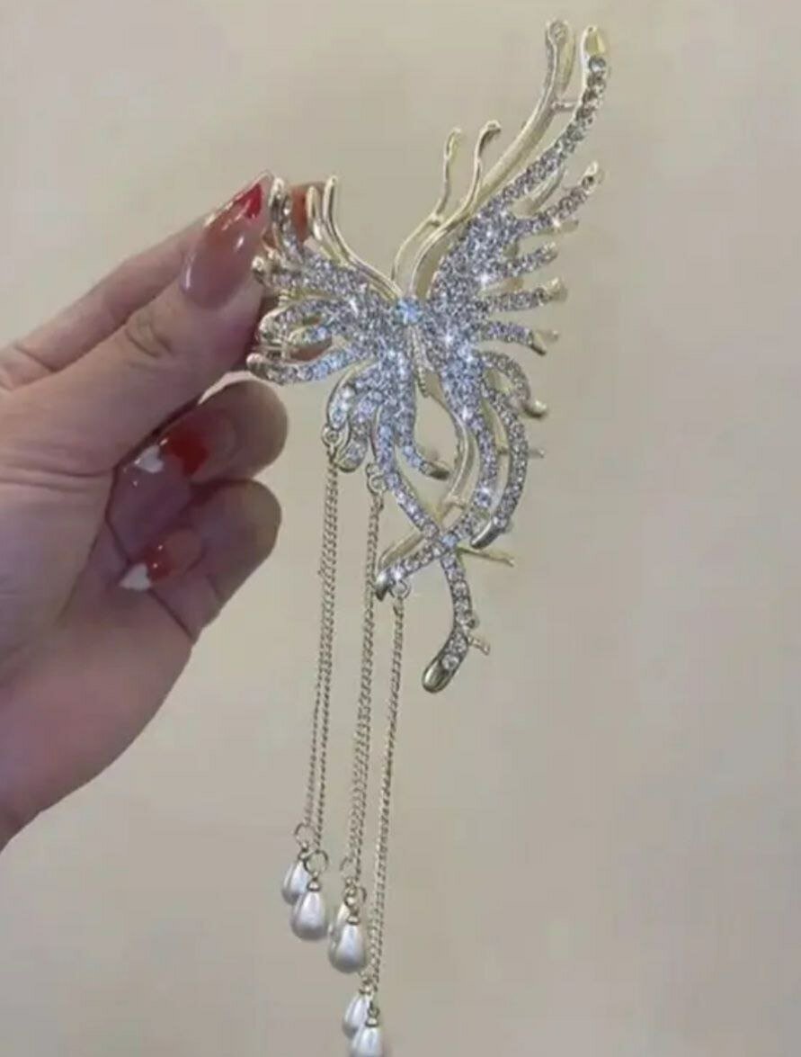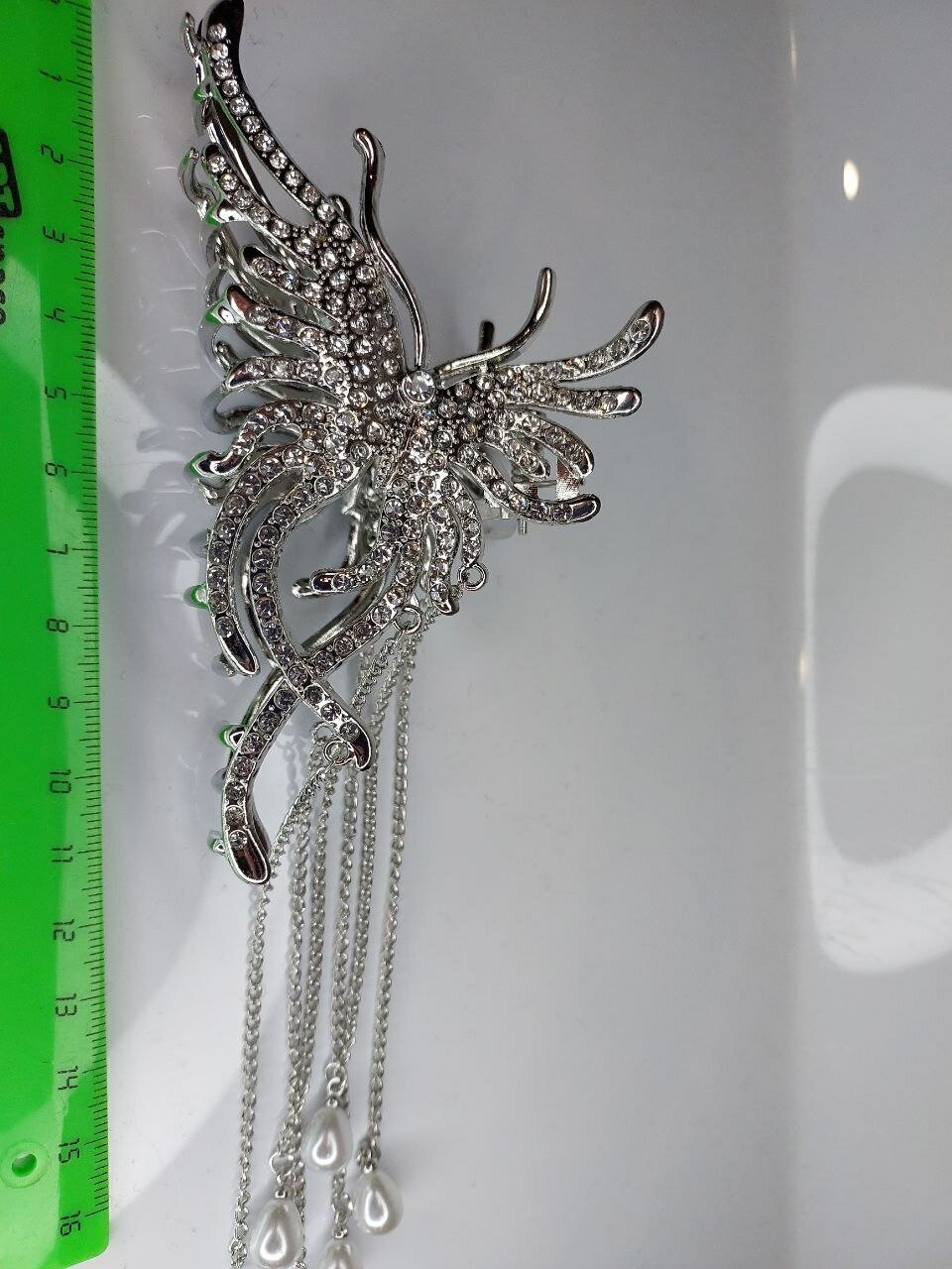 Заколка выполнена в форме "Пушистой бабочки" с золотистым покрытием, что придает ей роскошный и элегантный вид. Стразы на заколке добавляют изысканности и блеска, делая образ еще более привлекательным.
