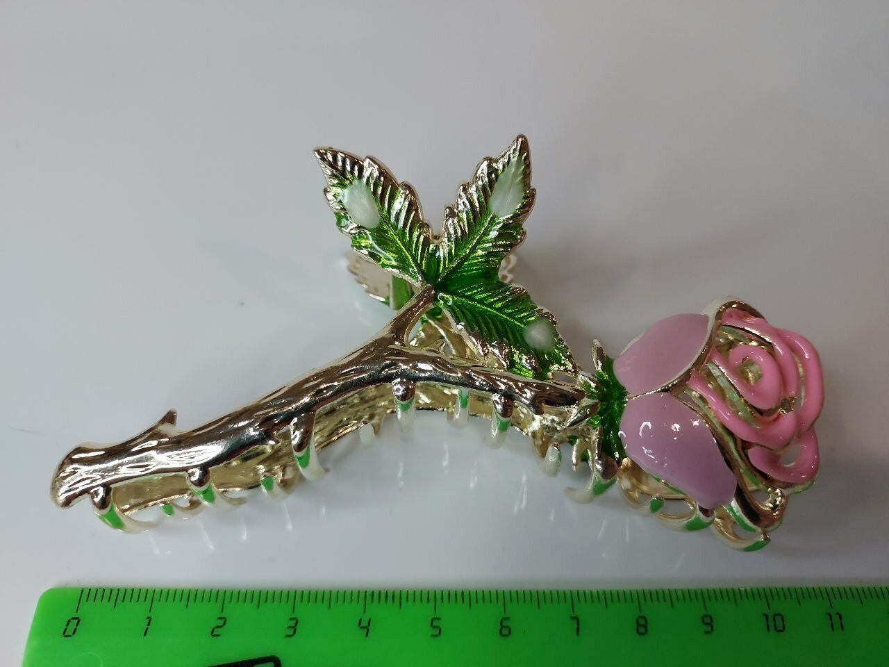 Заколка изготовлена из прочного металла, что гарантирует ее долговечность и надежность в использовании. Усиленная конструкция обеспечивает дополнительную прочность и устойчивость к износу.