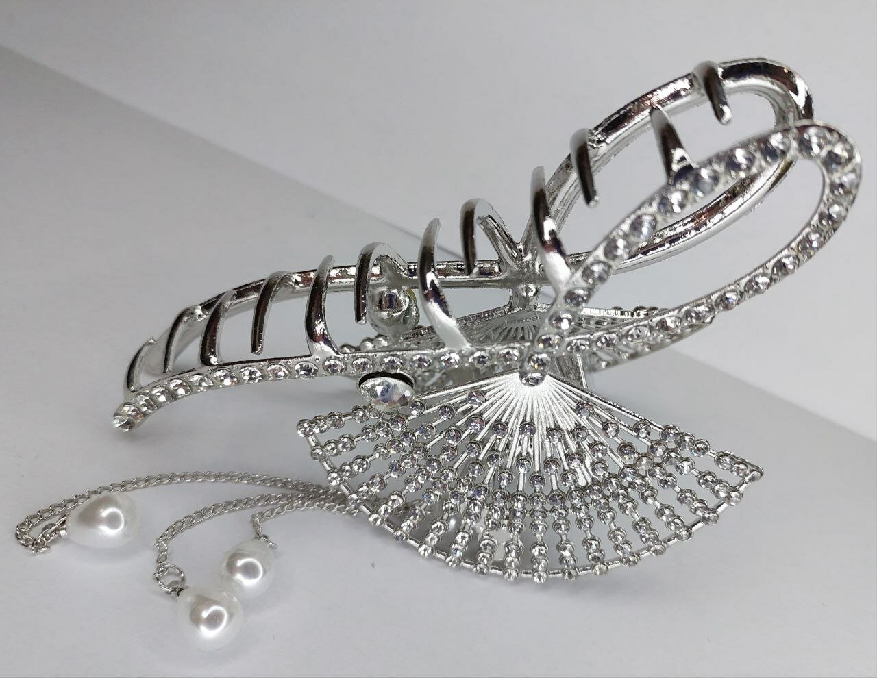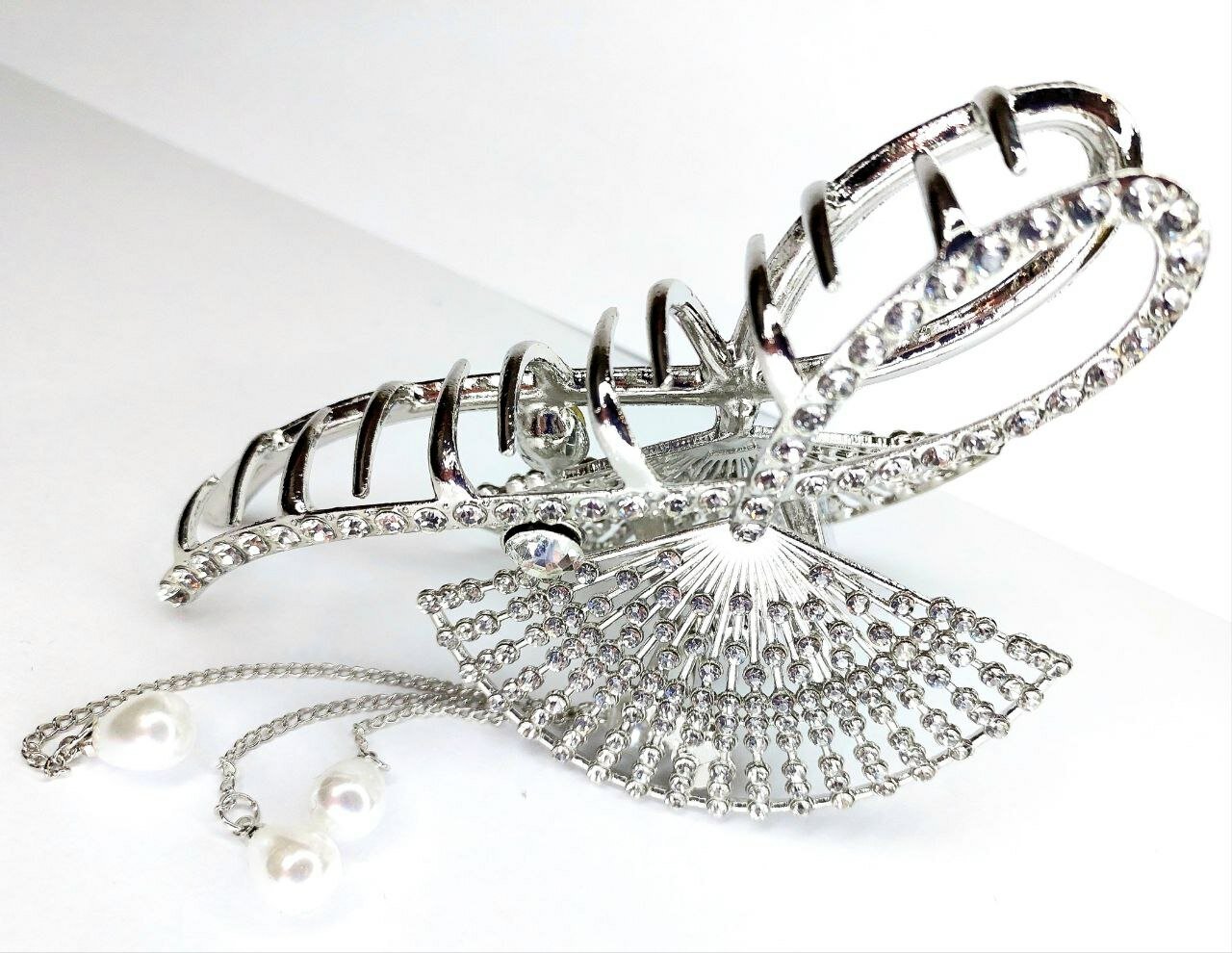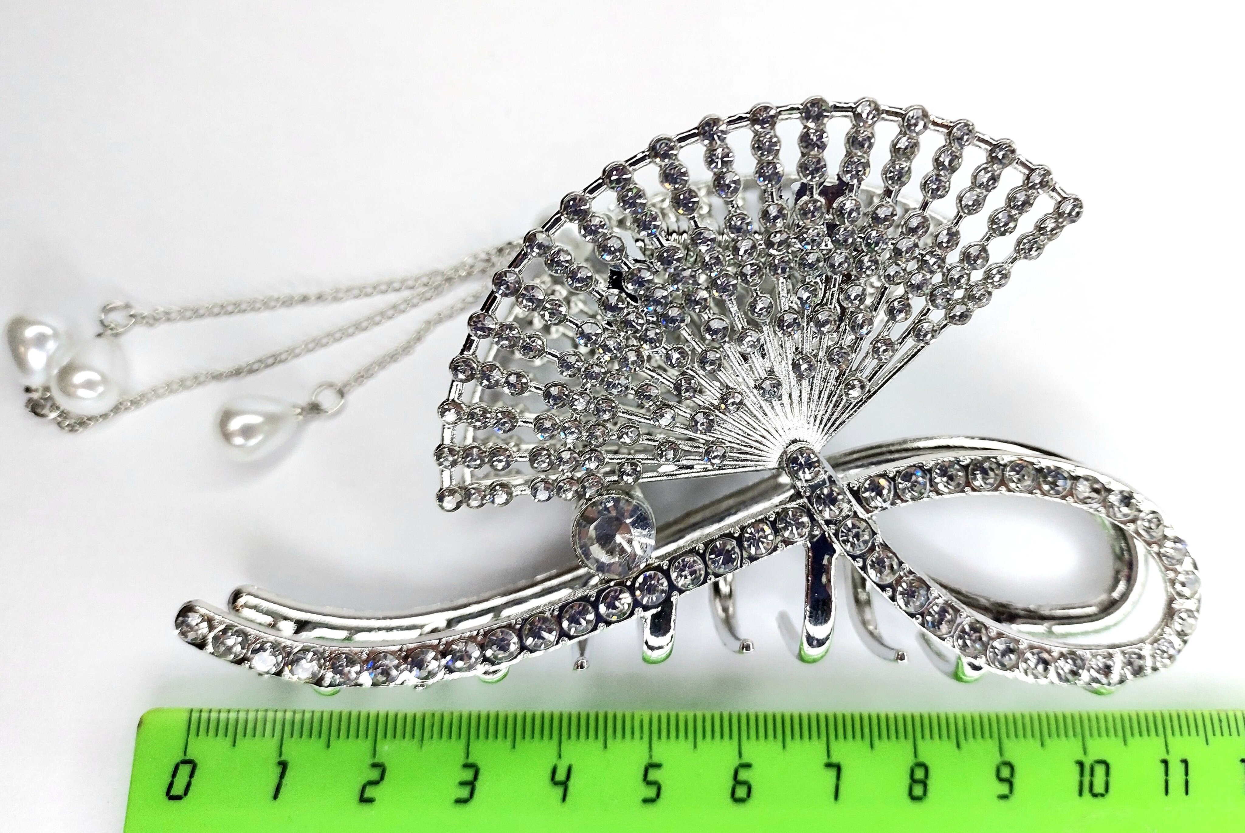 Заколка-краб для волос "Веер", инкрустированная стразами, металл усиленная, цвет - серебро. Изготовлена из высококачественного металла, что обеспечивает ее долговечность и прочность. Заколка имеет удобную форму, которая позволяет легко фиксировать волосы и создавать различные прически. Благодаря стразам, заколка-краб выглядит очень эффектно и стильно, что делает ее идеальным аксессуаром для вечерних и праздничных мероприятий. Она также может использоваться для повседневного использования и создания повседневных образов. Заколку можно использовать как самостоятельно, так и в сочетании с другими аксессуарами для волос.