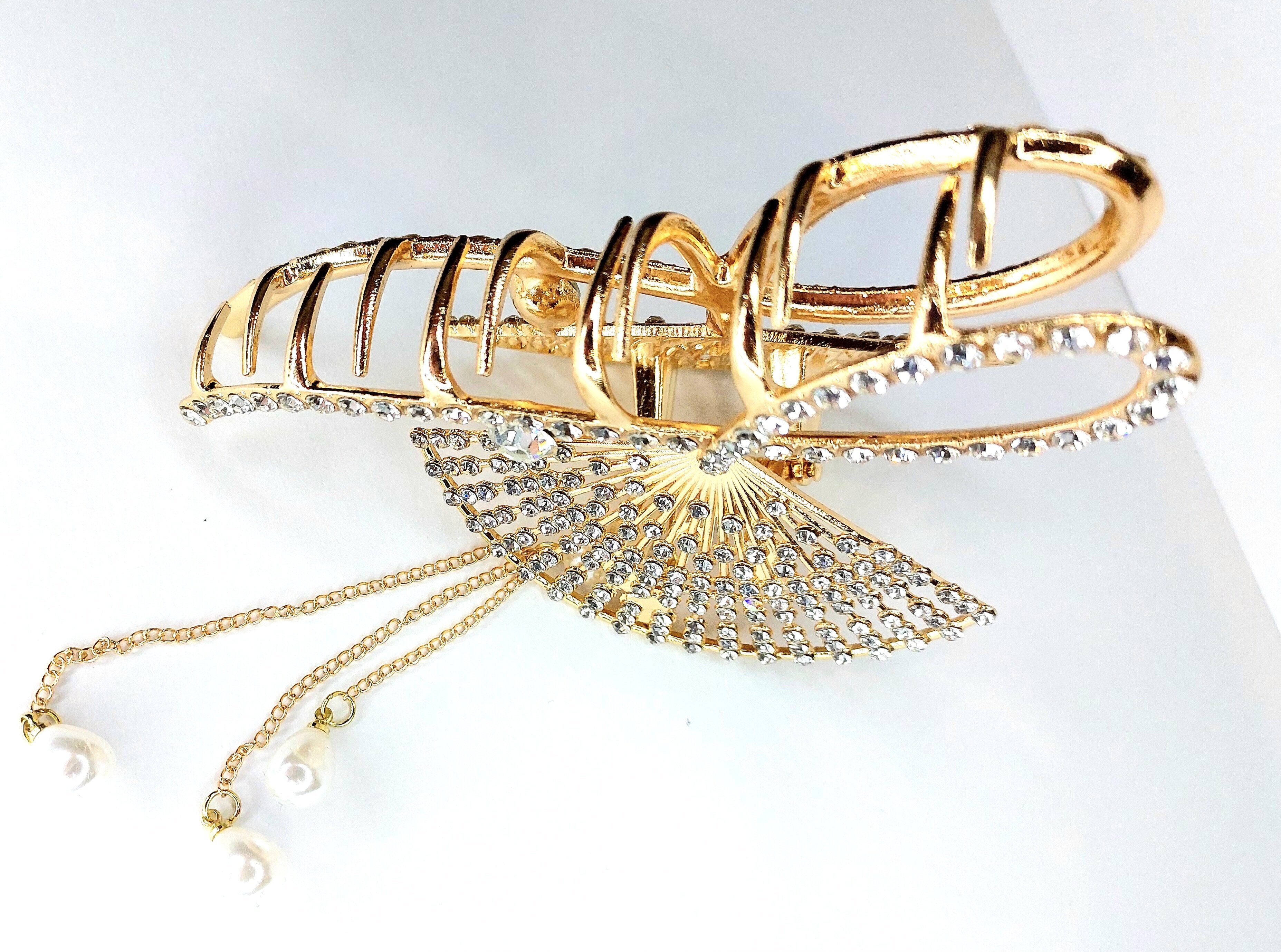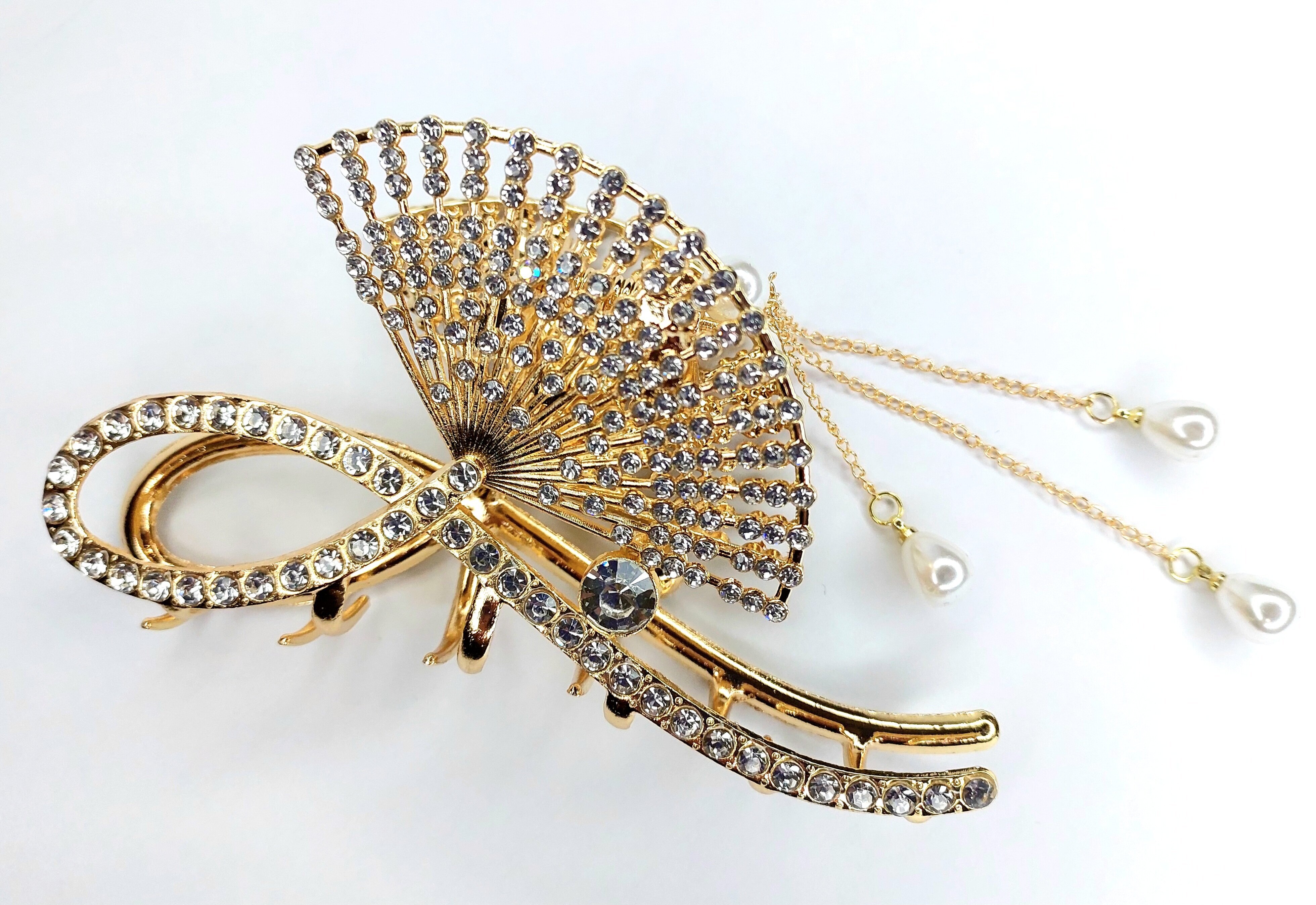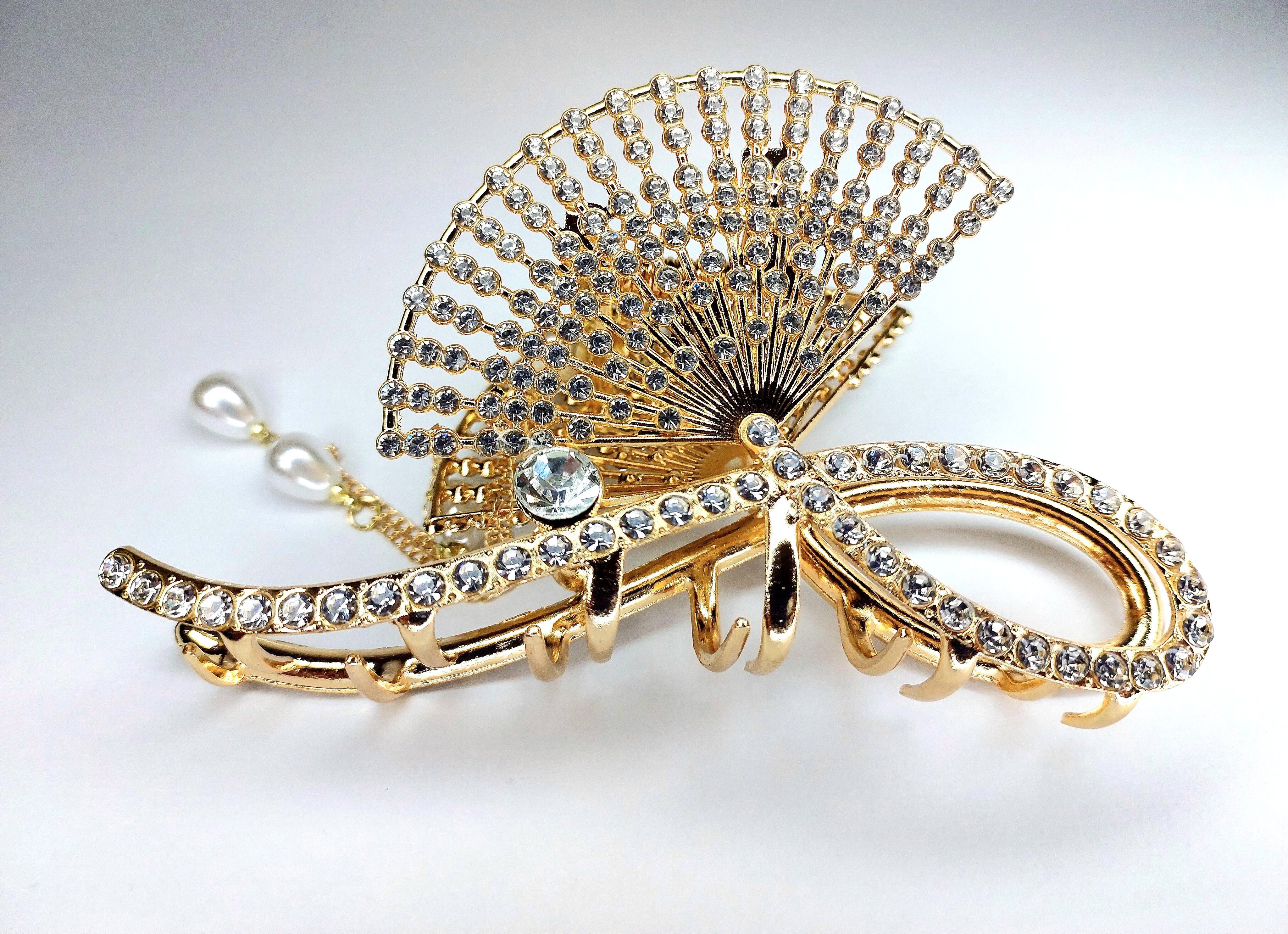 Заколка -краб для волос "Веер" инкрустированный стразами. Металл Усиленная. Цвет золото