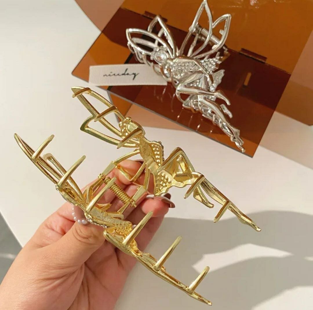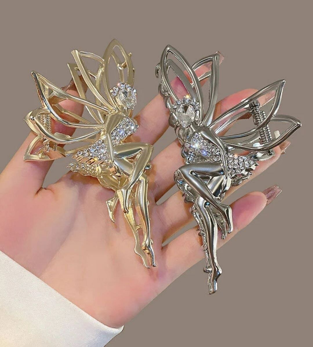 Заколка "Фея", выполненная из качественного желтого металла, инкрустирована стразами, что придает ей изысканный вид. Она подойдет для создания праздничных образов и повседневного использования.